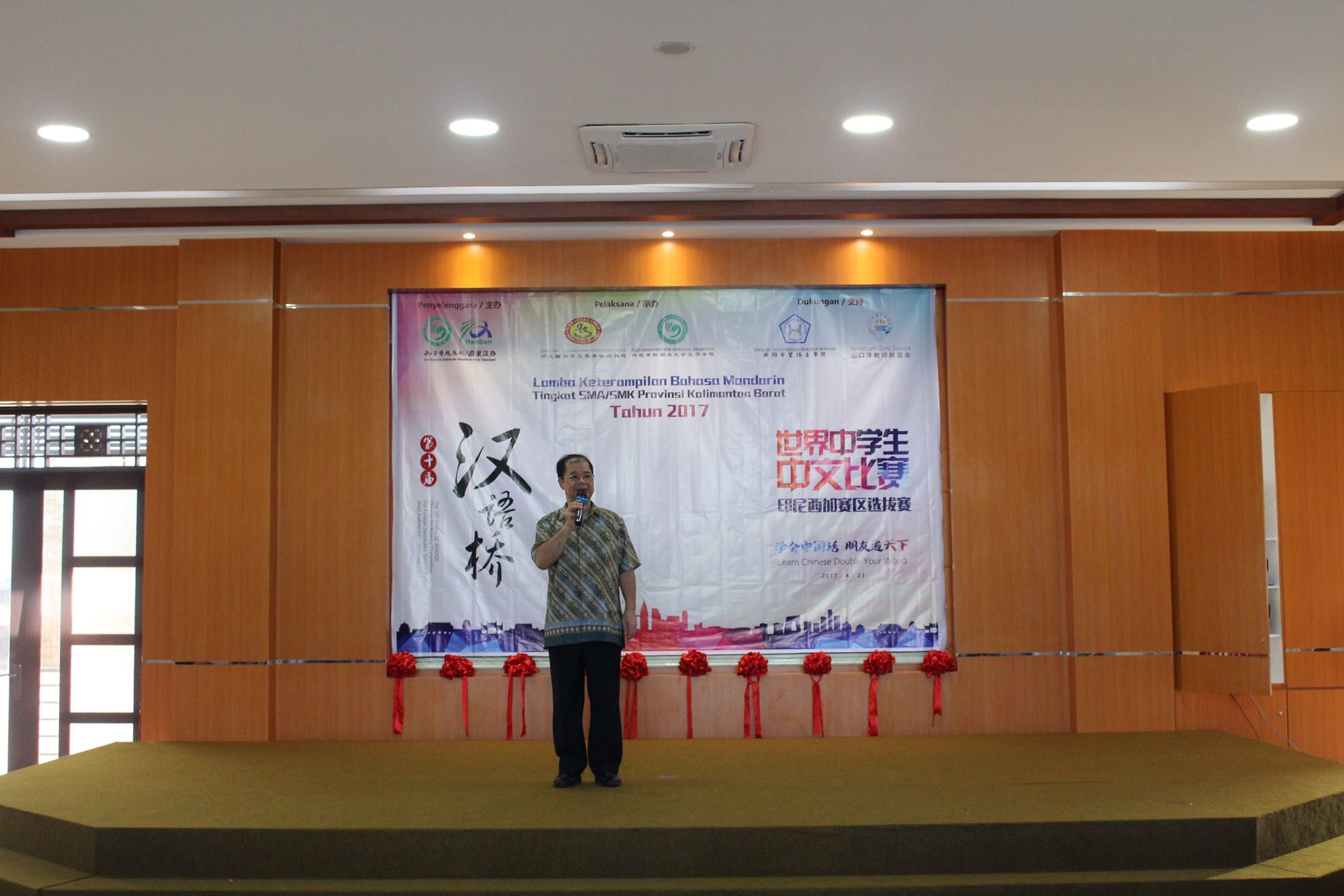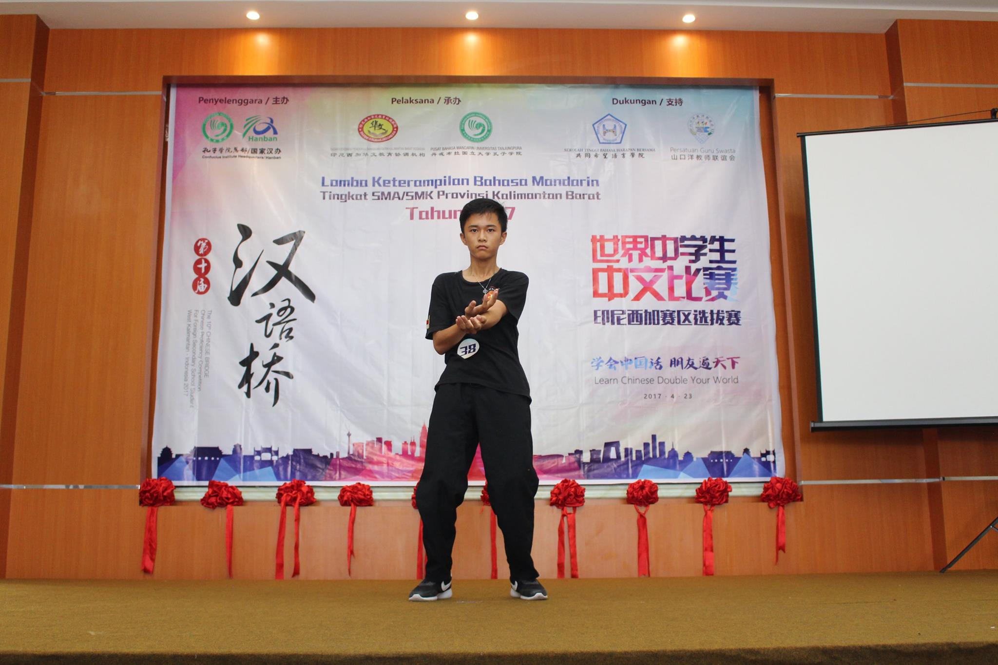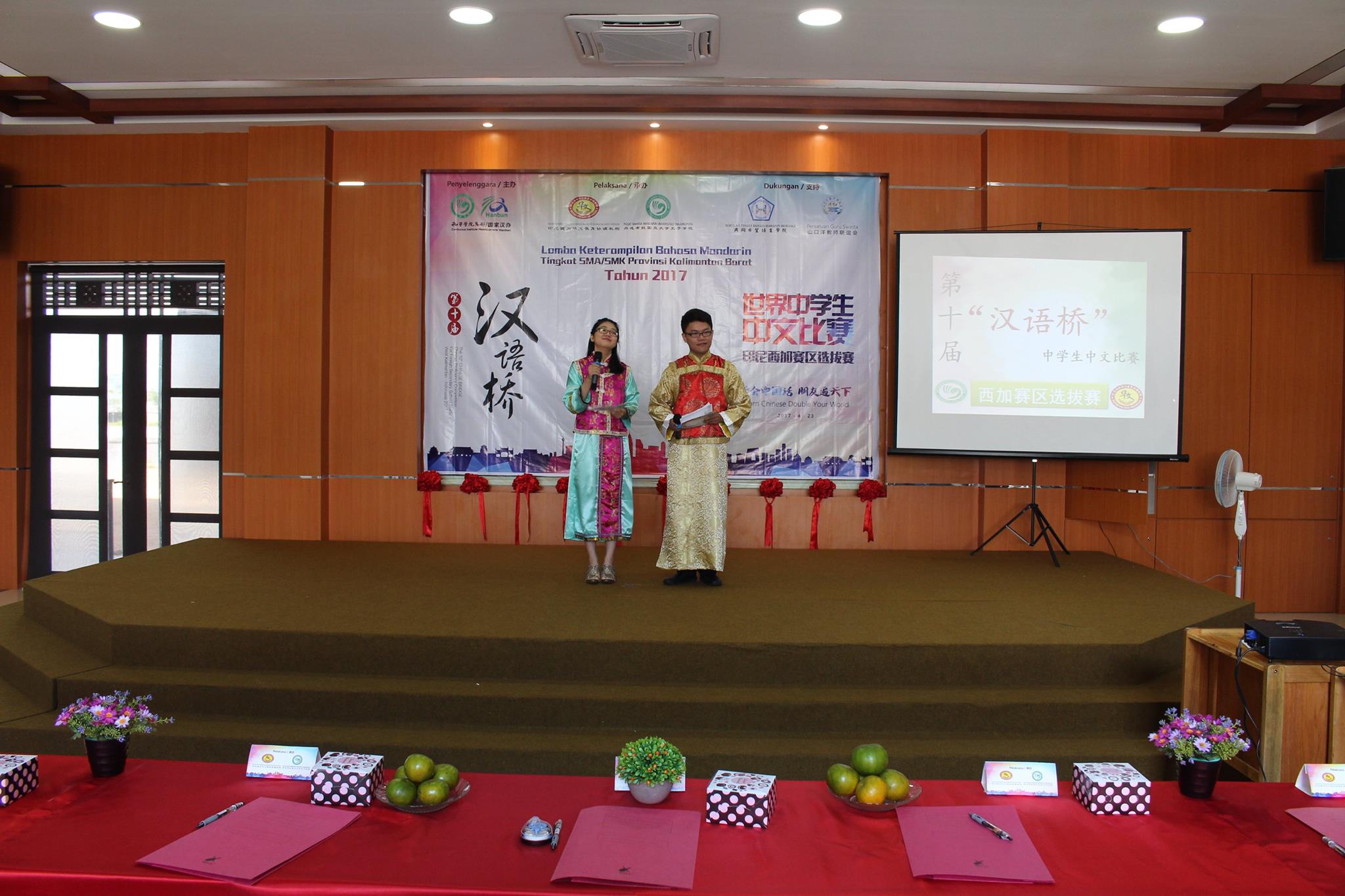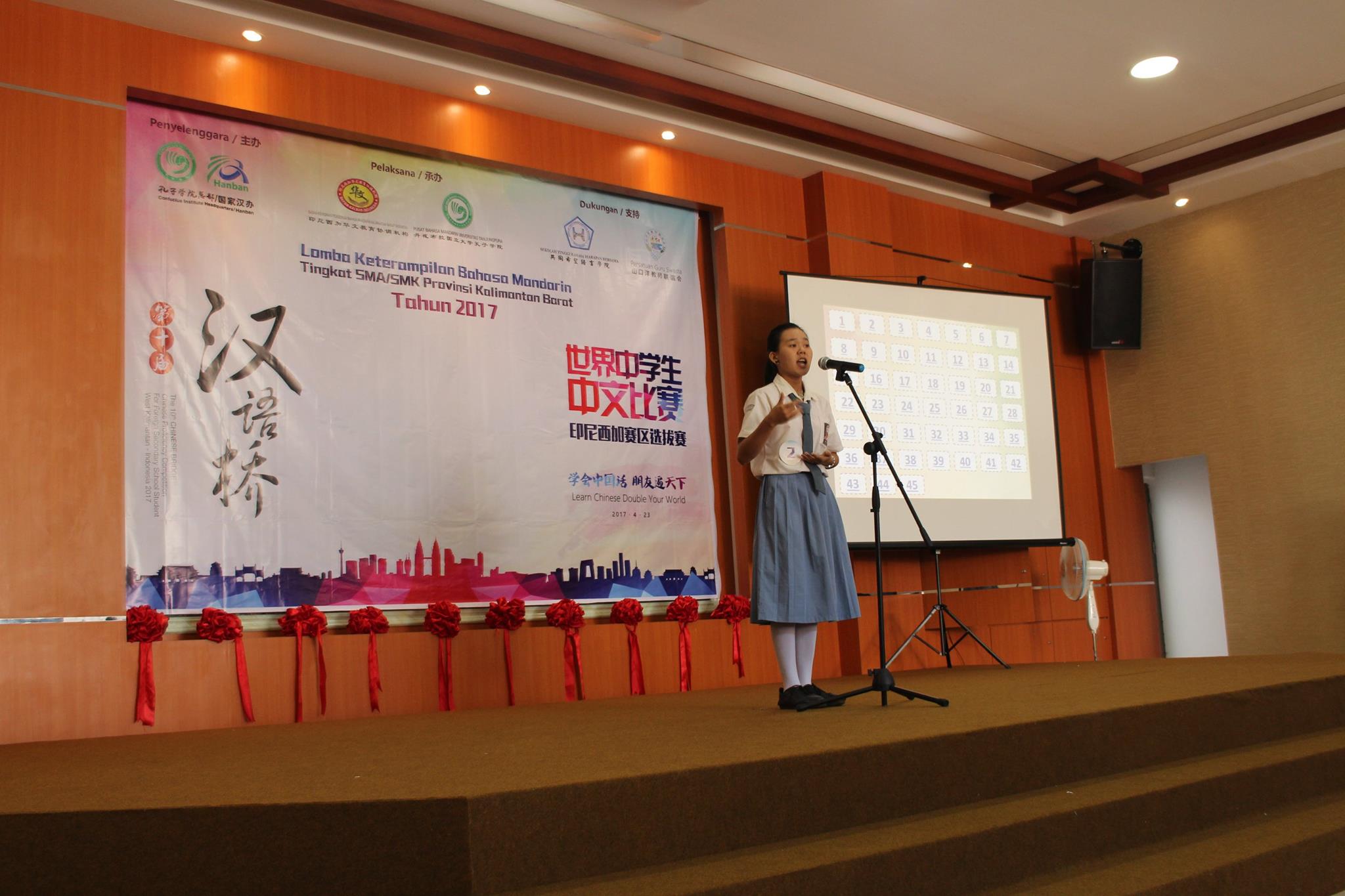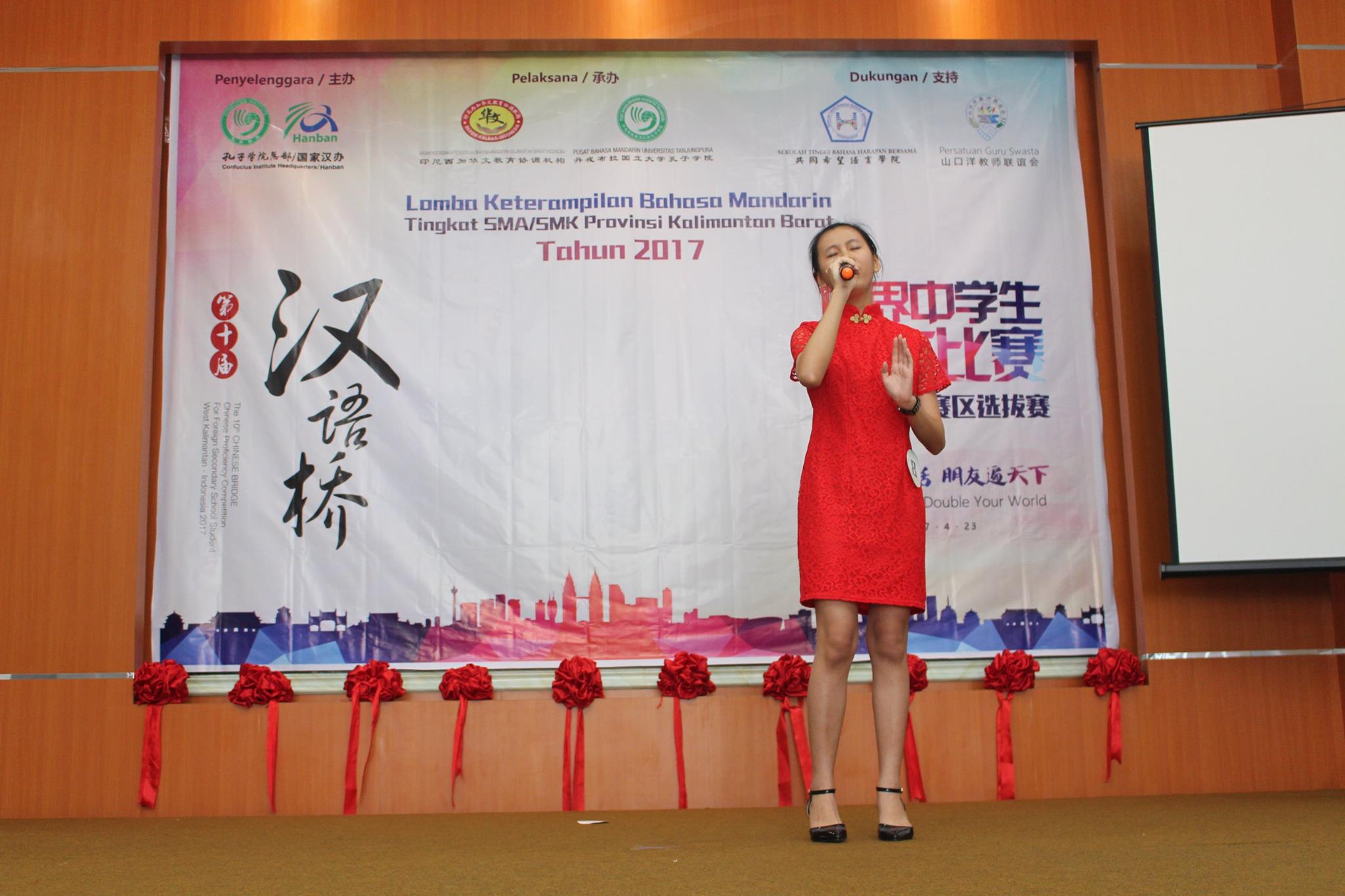 【坤甸日报讯】2017年4月23日,由丹戎布拉国立大学孔子学院和西加华文教育协调机构联合承办,由坤甸共同希望语言学院和山口洋教师联谊会协办的第十届“汉语桥”中文比赛——印尼西加省赛区选拔赛坤甸市以共同希望语言学院举行。莅临比赛现场的嘉宾有坤甸市议员刘建源先生,丹大孔院中方院长冯光火先生,西加印中商务理事代表BAPAK JIMMY THE,西加华文教育机构副主席陈得时先生、理事吴宝安先生、李鸿时先生、余炜华老师、贝成群夫人、沈丽璇女士、林瑞璇女士、刘玉瑛老师、薛惠芳老师、林丽君老师,西加协调驻道房代办黄思渊女士,坤甸共同希望语言学院校长IBU SUKARSIH DPANJAITAN MAS’UD, S.E., M.M.以及众评委、师生等逾百人出席了此次比赛。