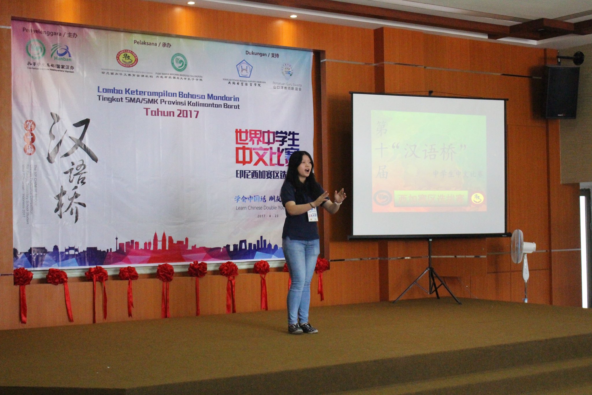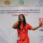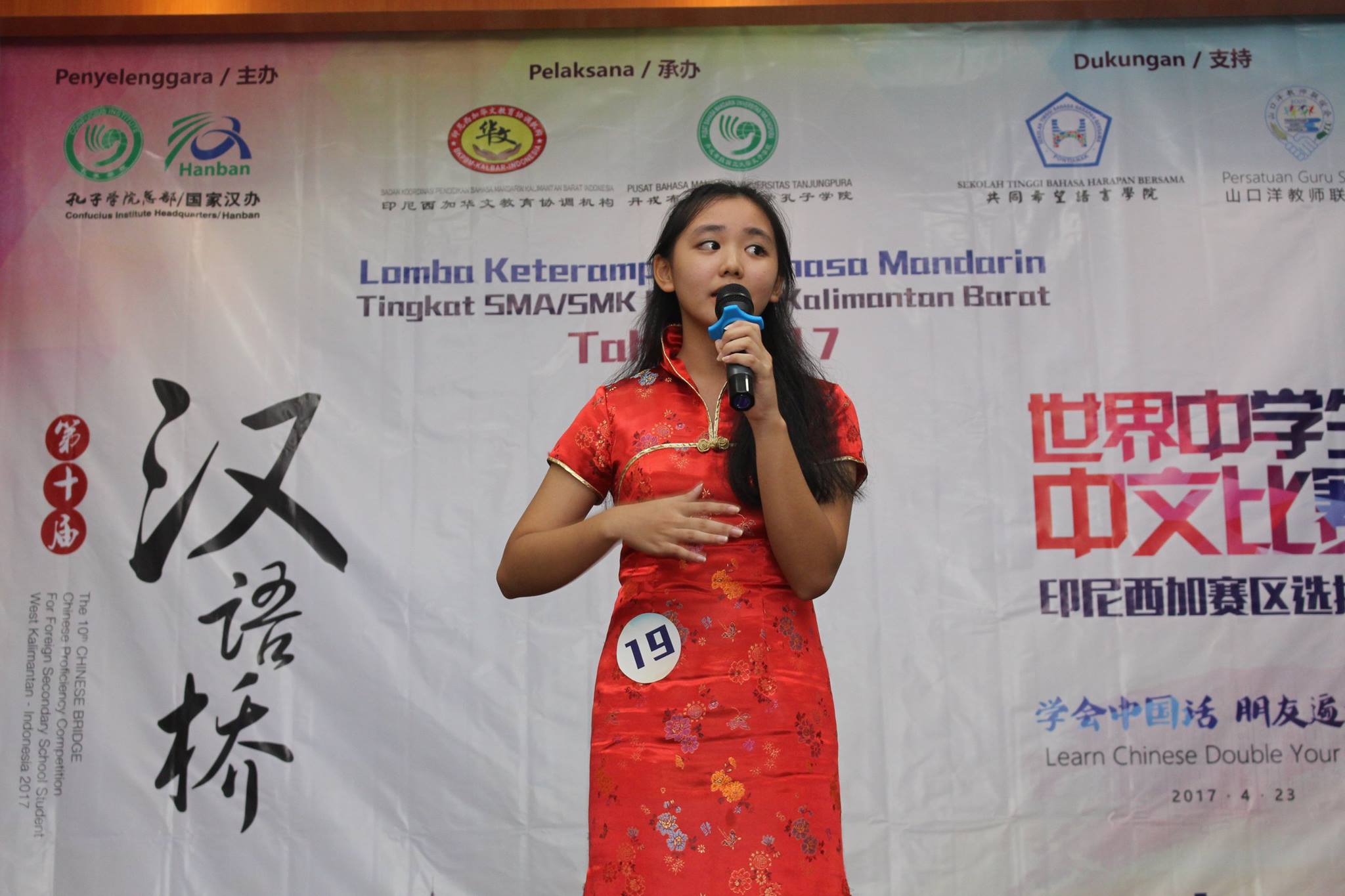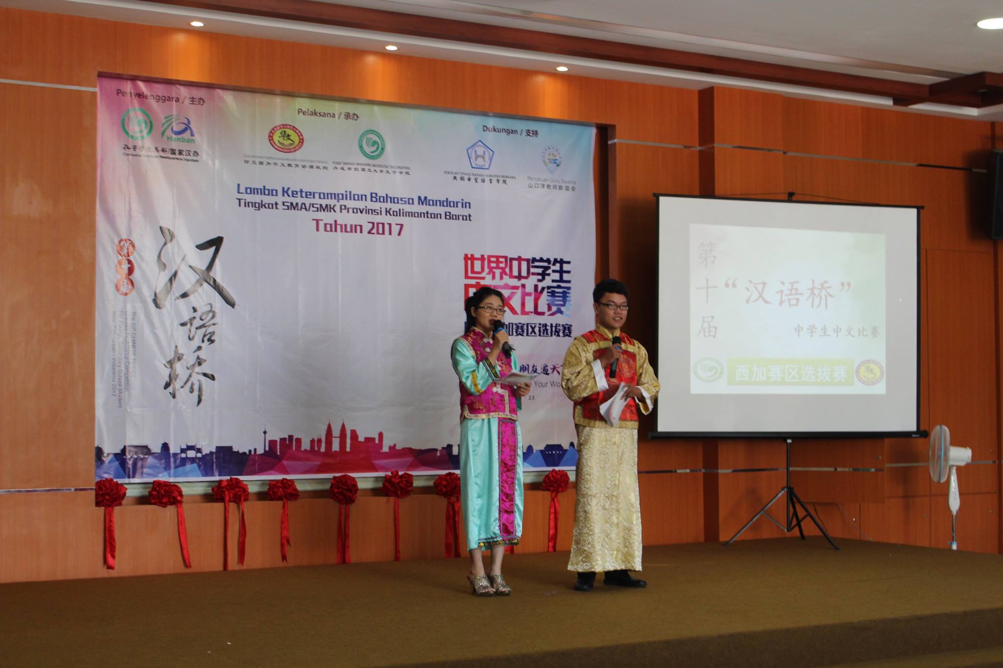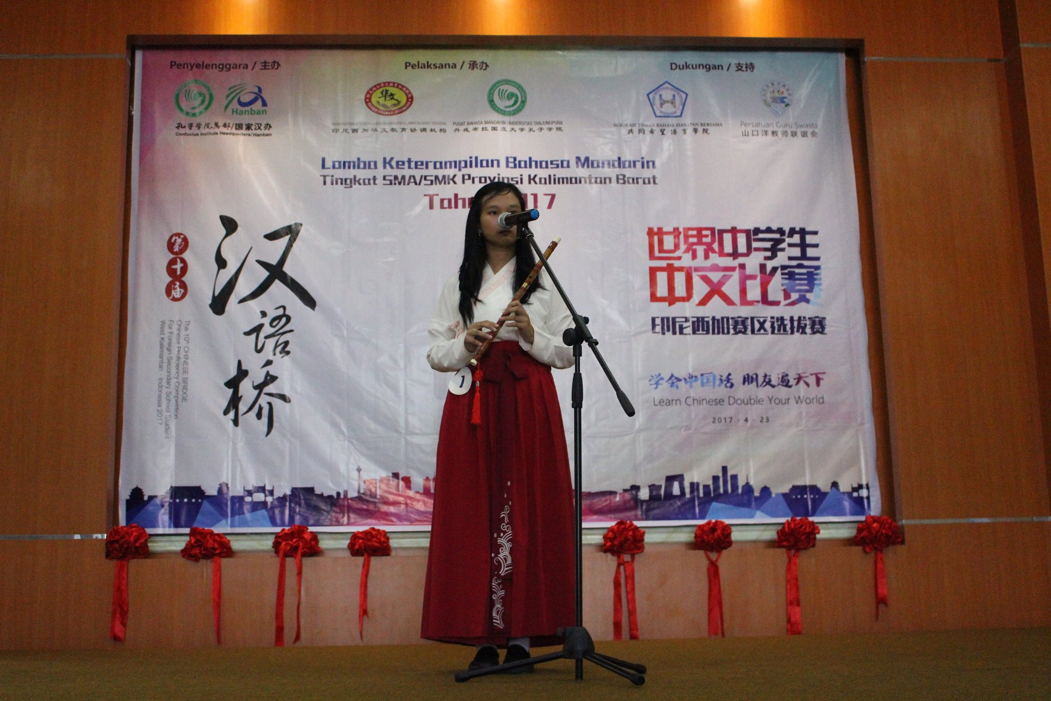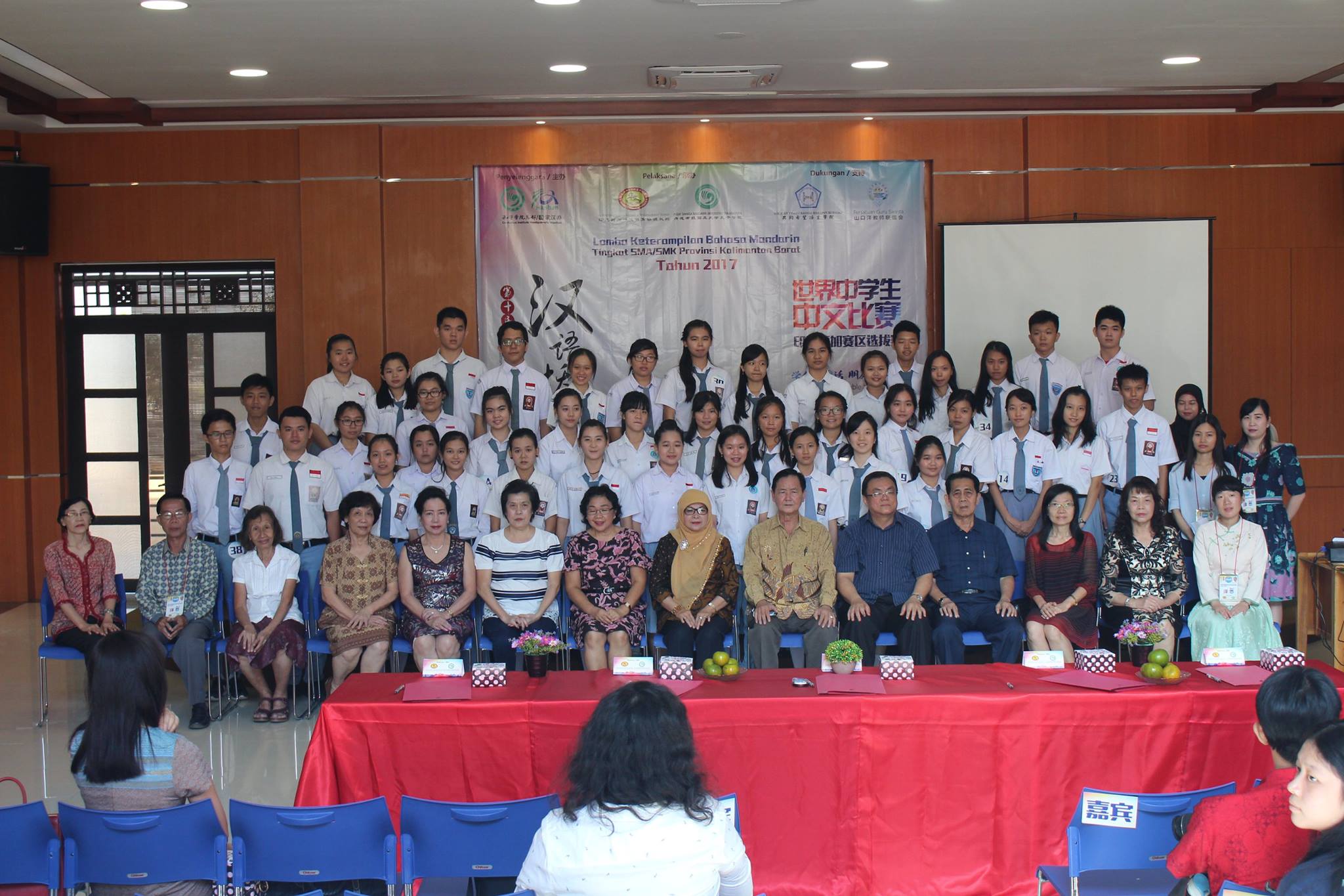 【坤甸日报讯】2017年4月23日,由丹戎布拉国立大学孔子学院和西加华文教育协调机构联合承办,由坤甸共同希望语言学院和山口洋教师联谊会协办的第十届“汉语桥”中文比赛——印尼西加省赛区选拔赛坤甸市以共同希望语言学院举行。莅临比赛现场的嘉宾有坤甸市议员刘建源先生,丹大孔院中方院长冯光火先生,西加印中商务理事代表BAPAK JIMMY THE,西加华文教育机构副主席陈得时先生、理事吴宝安先生、李鸿时先生、余炜华老师、贝成群夫人、沈丽璇女士、林瑞璇女士、刘玉瑛老师、薛惠芳老师、林丽君老师,西加协调驻道房代办黄思渊女士,坤甸共同希望语言学院校长IBU SUKARSIH DPANJAITAN MAS’UD, S.E., M.M.以及众评委、师生等逾百人出席了此次比赛。