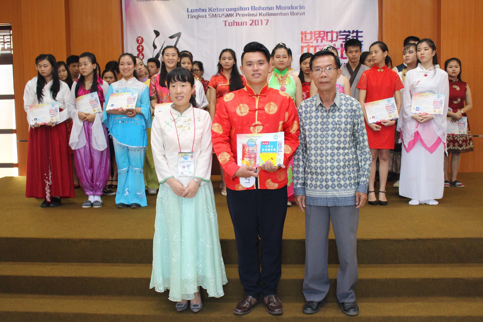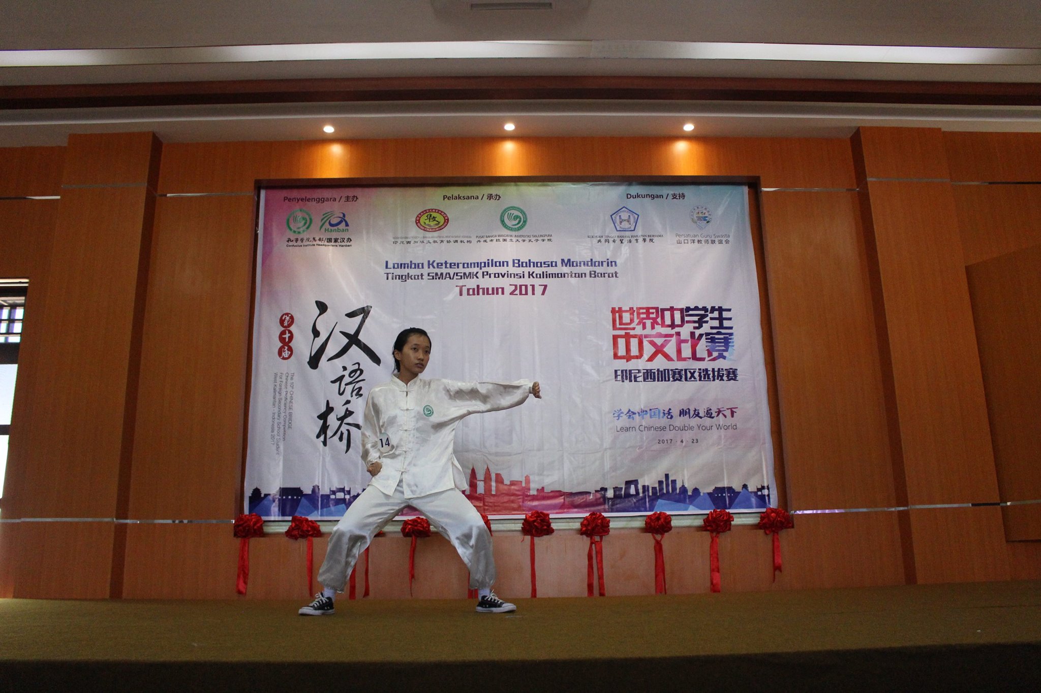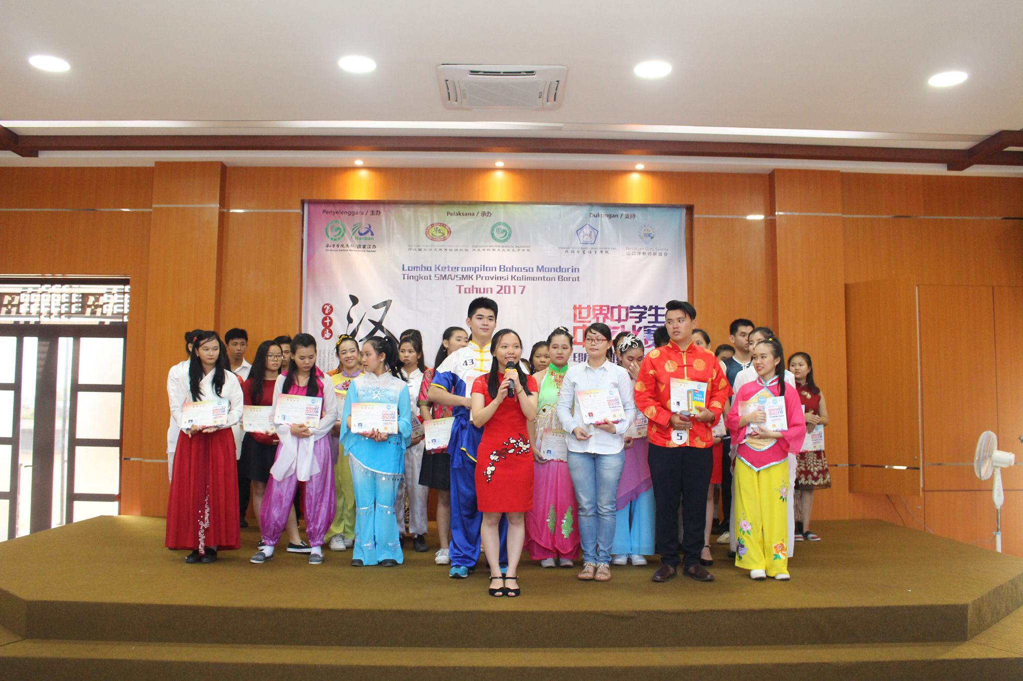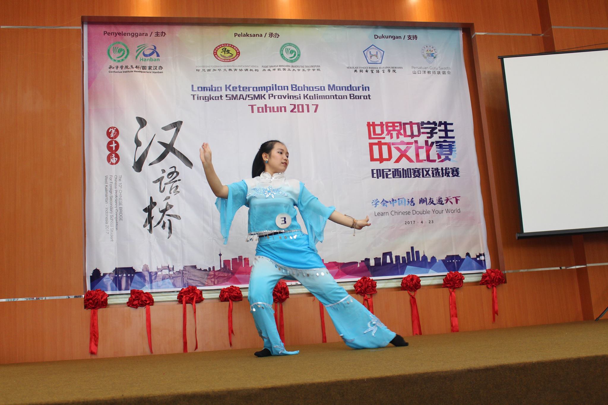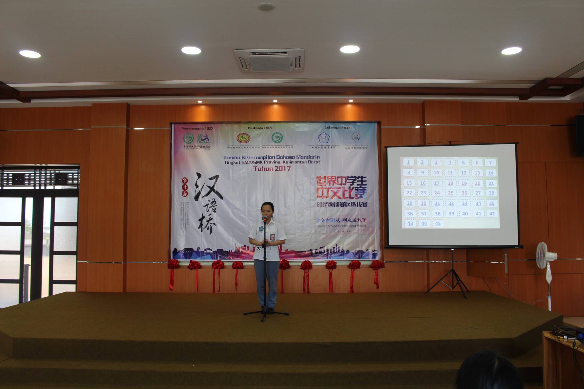 【坤甸日报讯】2017年4月23日,由丹戎布拉国立大学孔子学院和西加华文教育协调机构联合承办,由坤甸共同希望语言学院和山口洋教师联谊会协办的第十届“汉语桥”中文比赛——印尼西加省赛区选拔赛坤甸市以共同希望语言学院举行。莅临比赛现场的嘉宾有坤甸市议员刘建源先生,丹大孔院中方院长冯光火先生,西加印中商务理事代表BAPAK JIMMY THE,西加华文教育机构副主席陈得时先生、理事吴宝安先生、李鸿时先生、余炜华老师、贝成群夫人、沈丽璇女士、林瑞璇女士、刘玉瑛老师、薛惠芳老师、林丽君老师,西加协调驻道房代办黄思渊女士,坤甸共同希望语言学院校长IBU SUKARSIH DPANJAITAN MAS’UD, S.E., M.M.以及众评委、师生等逾百人出席了此次比赛。