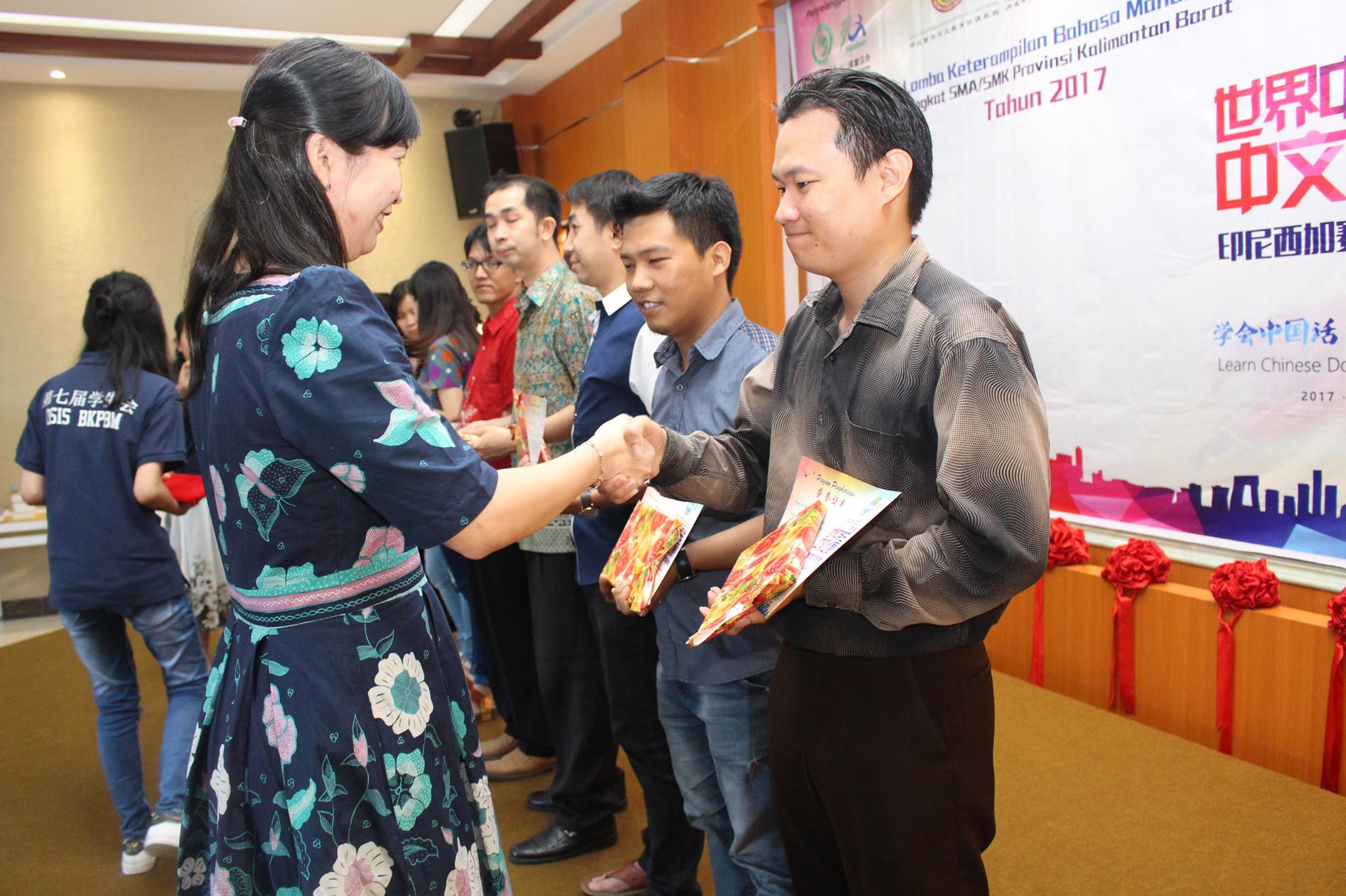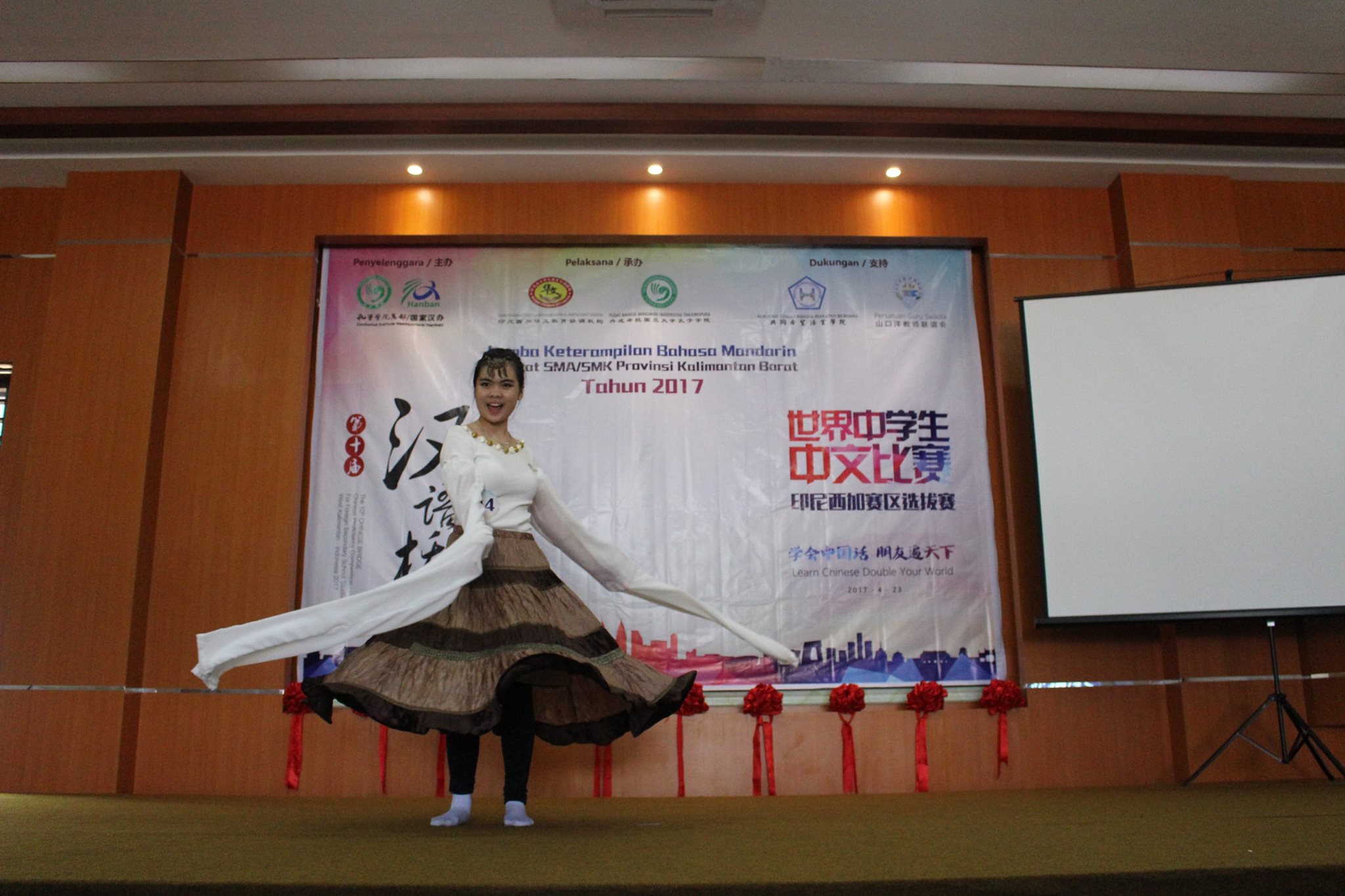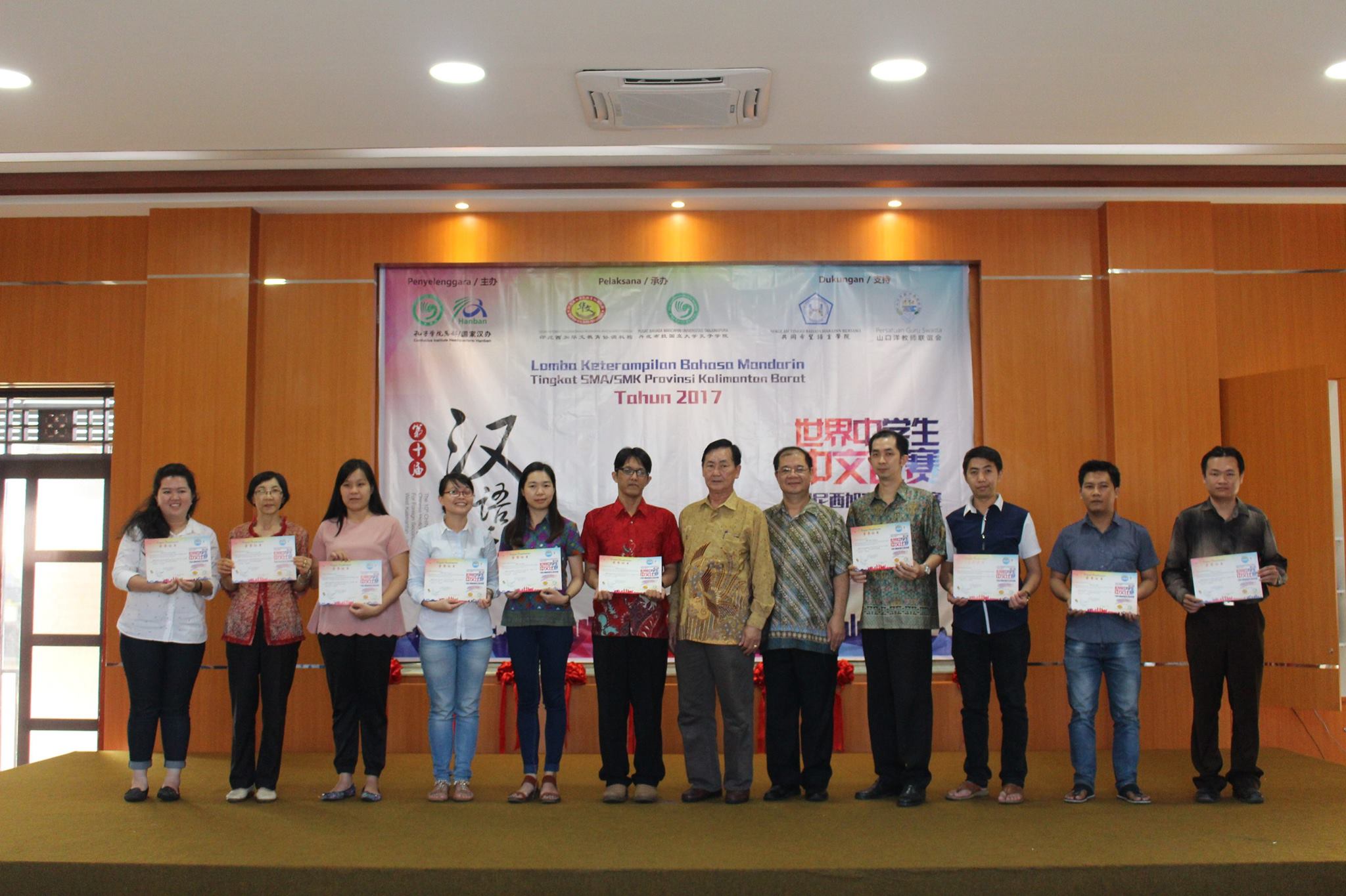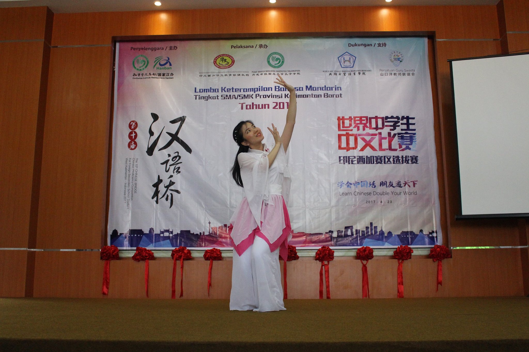 【坤甸日报讯】2017年4月23日,由丹戎布拉国立大学孔子学院和西加华文教育协调机构联合承办,由坤甸共同希望语言学院和山口洋教师联谊会协办的第十届“汉语桥”中文比赛——印尼西加省赛区选拔赛坤甸市以共同希望语言学院举行。莅临比赛现场的嘉宾有坤甸市议员刘建源先生,丹大孔院中方院长冯光火先生,西加印中商务理事代表BAPAK JIMMY THE,西加华文教育机构副主席陈得时先生、理事吴宝安先生、李鸿时先生、余炜华老师、贝成群夫人、沈丽璇女士、林瑞璇女士、刘玉瑛老师、薛惠芳老师、林丽君老师,西加协调驻道房代办黄思渊女士,坤甸共同希望语言学院校长IBU SUKARSIH DPANJAITAN MAS’UD, S.E., M.M.以及众评委、师生等逾百人出席了此次比赛。