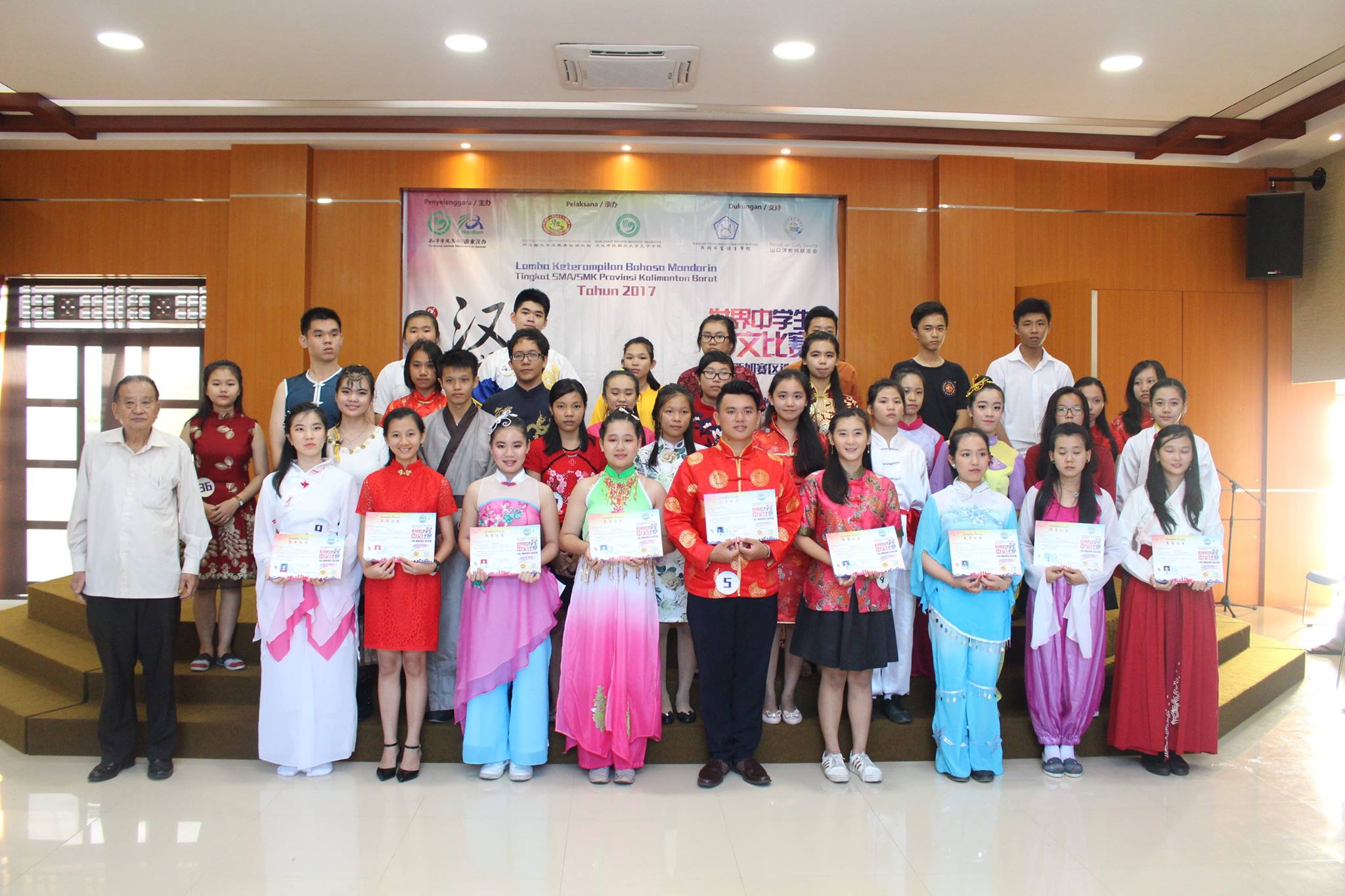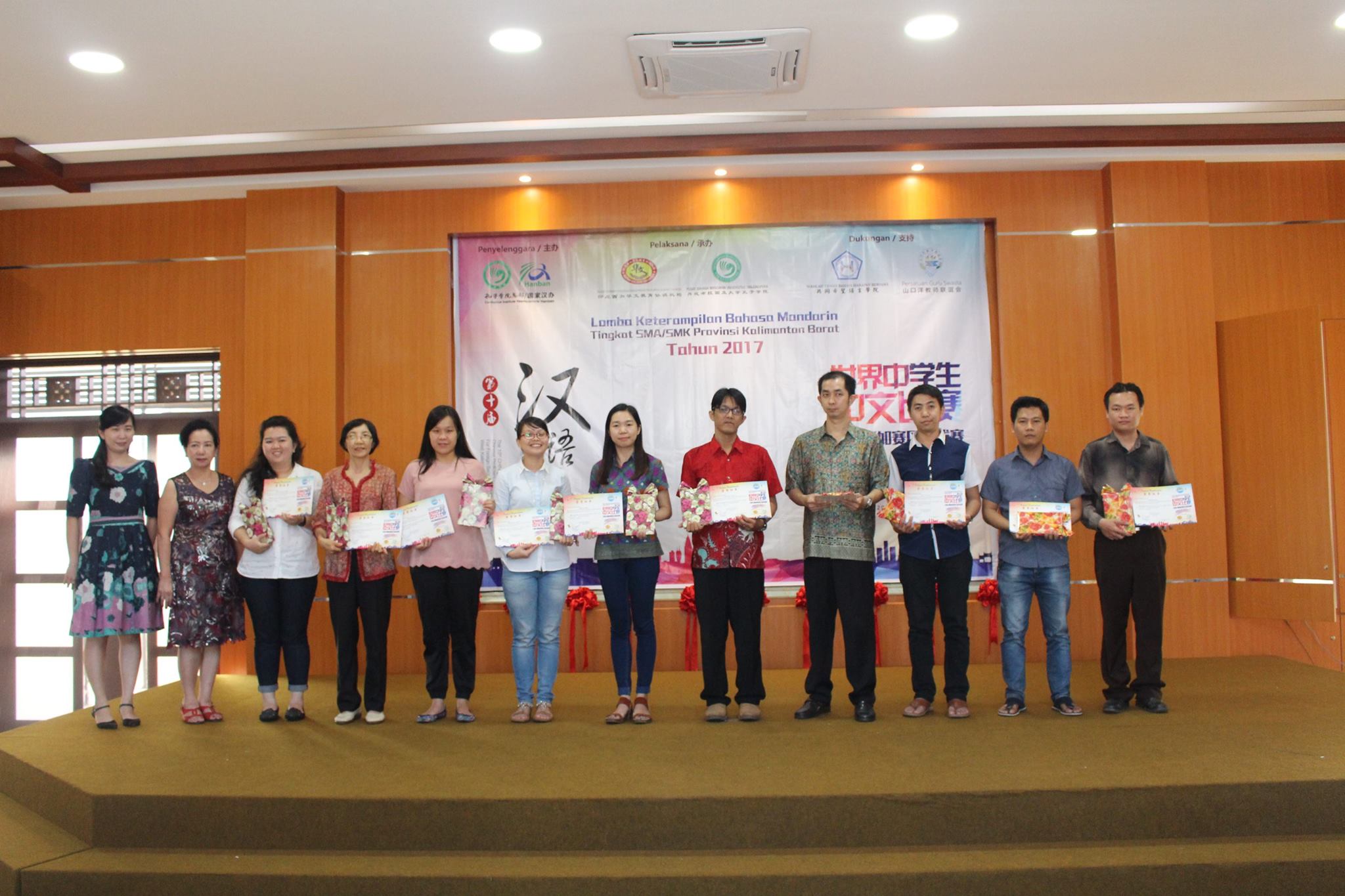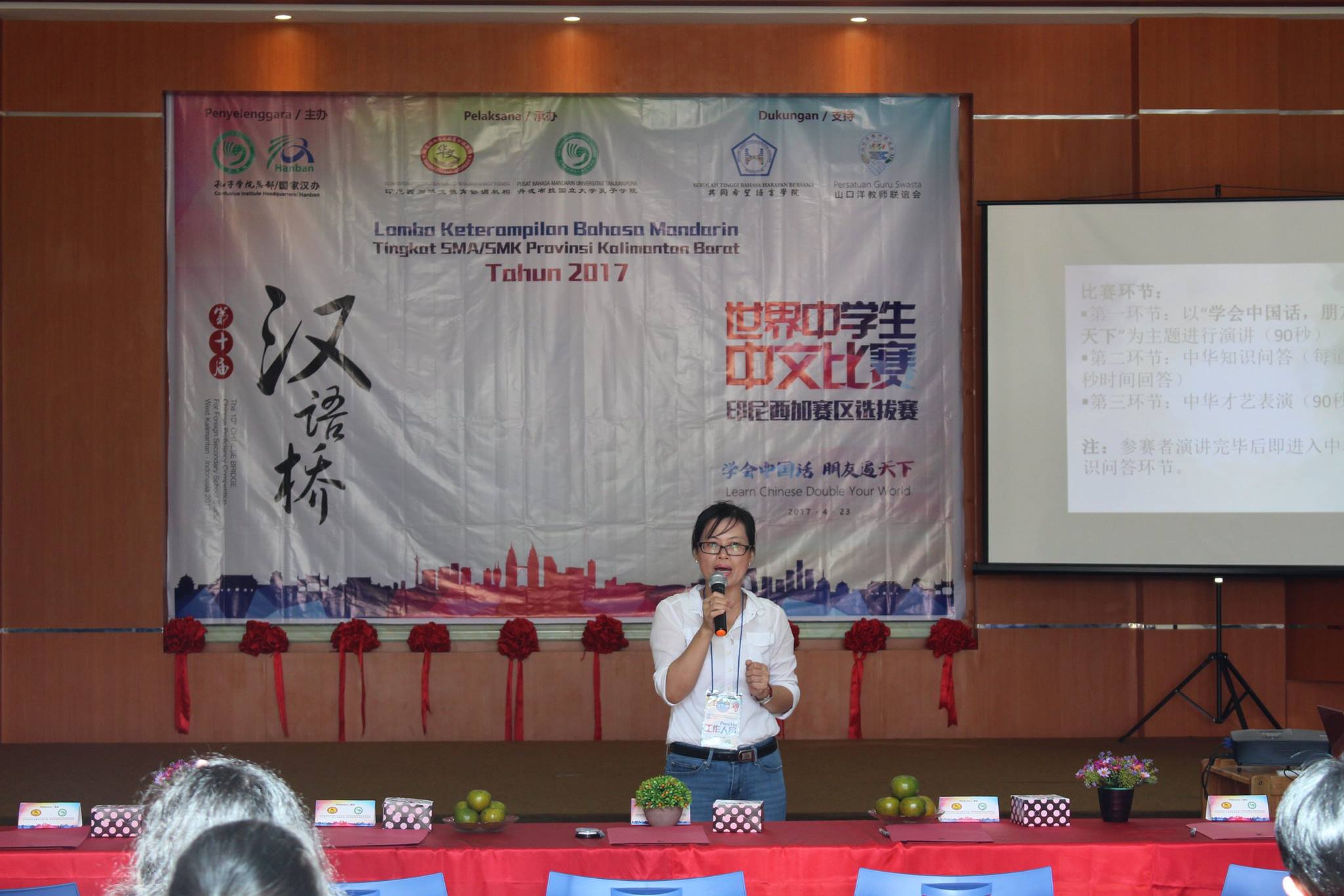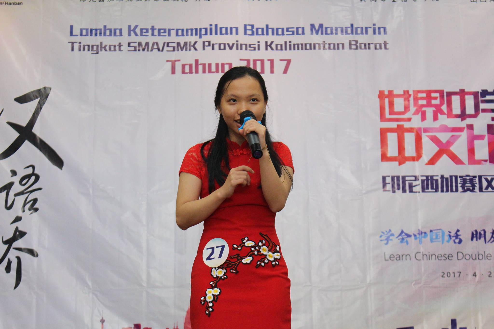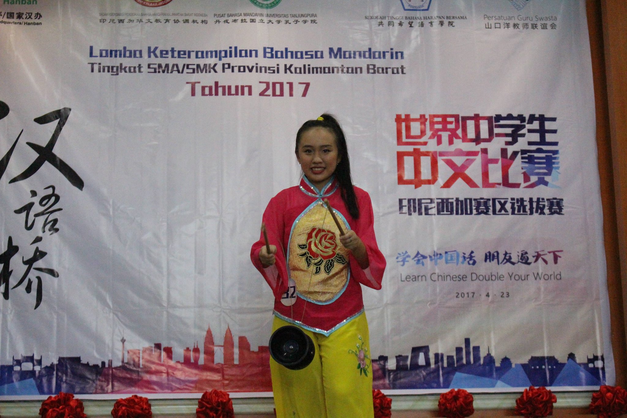 【坤甸日报讯】2017年4月23日,由丹戎布拉国立大学孔子学院和西加华文教育协调机构联合承办,由坤甸共同希望语言学院和山口洋教师联谊会协办的第十届“汉语桥”中文比赛——印尼西加省赛区选拔赛坤甸市以共同希望语言学院举行。莅临比赛现场的嘉宾有坤甸市议员刘建源先生,丹大孔院中方院长冯光火先生,西加印中商务理事代表BAPAK JIMMY THE,西加华文教育机构副主席陈得时先生、理事吴宝安先生、李鸿时先生、余炜华老师、贝成群夫人、沈丽璇女士、林瑞璇女士、刘玉瑛老师、薛惠芳老师、林丽君老师,西加协调驻道房代办黄思渊女士,坤甸共同希望语言学院校长IBU SUKARSIH DPANJAITAN MAS’UD, S.E., M.M.以及众评委、师生等逾百人出席了此次比赛。