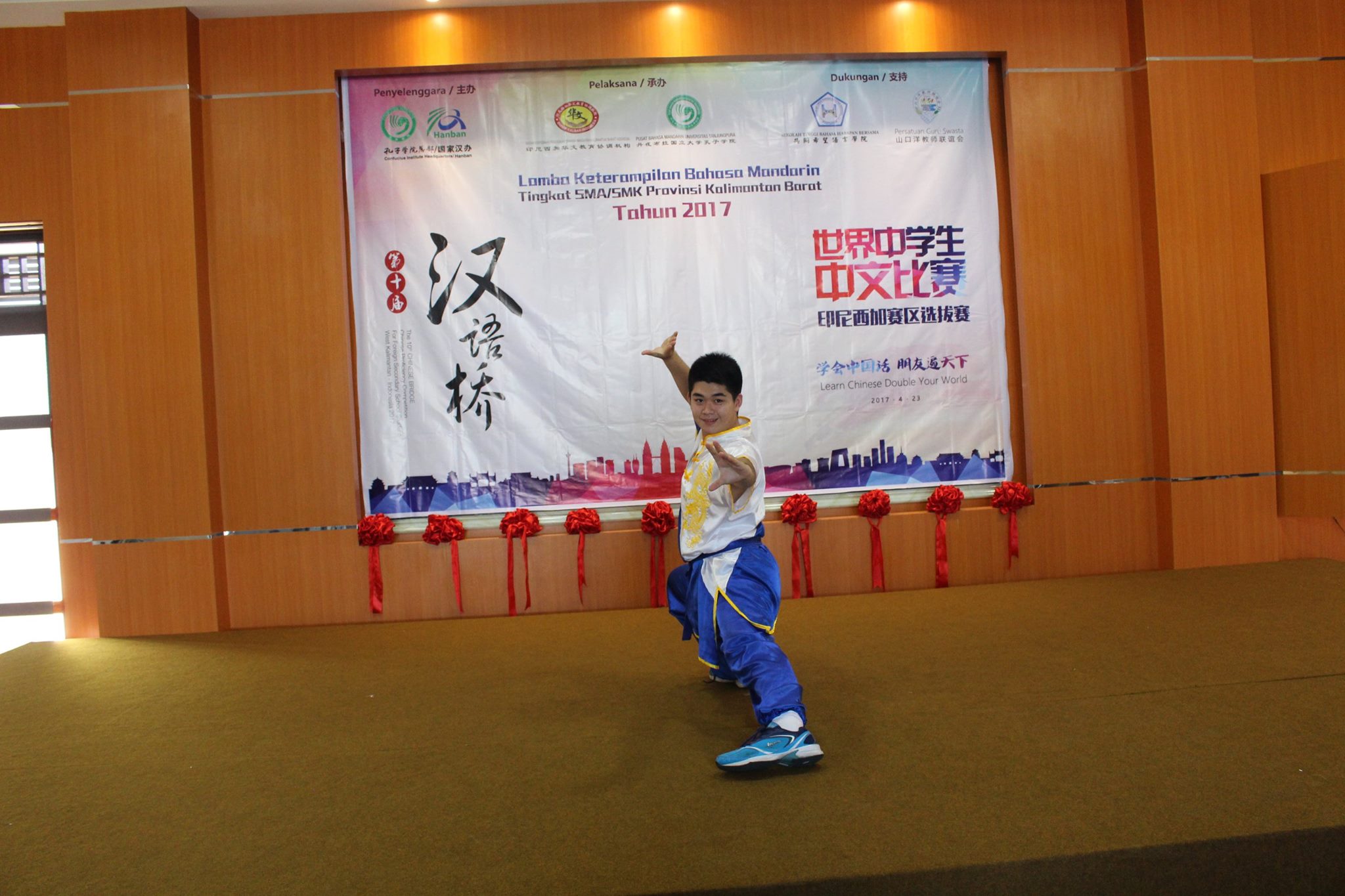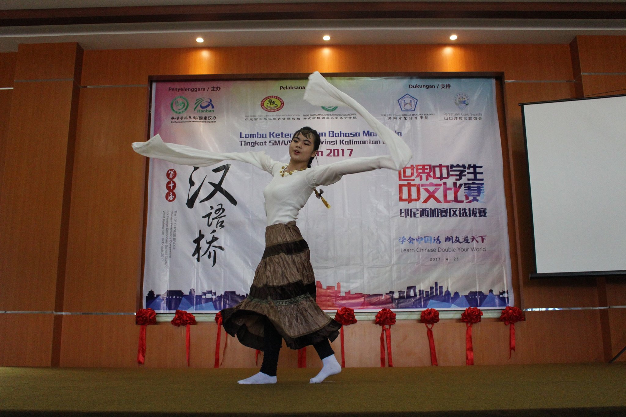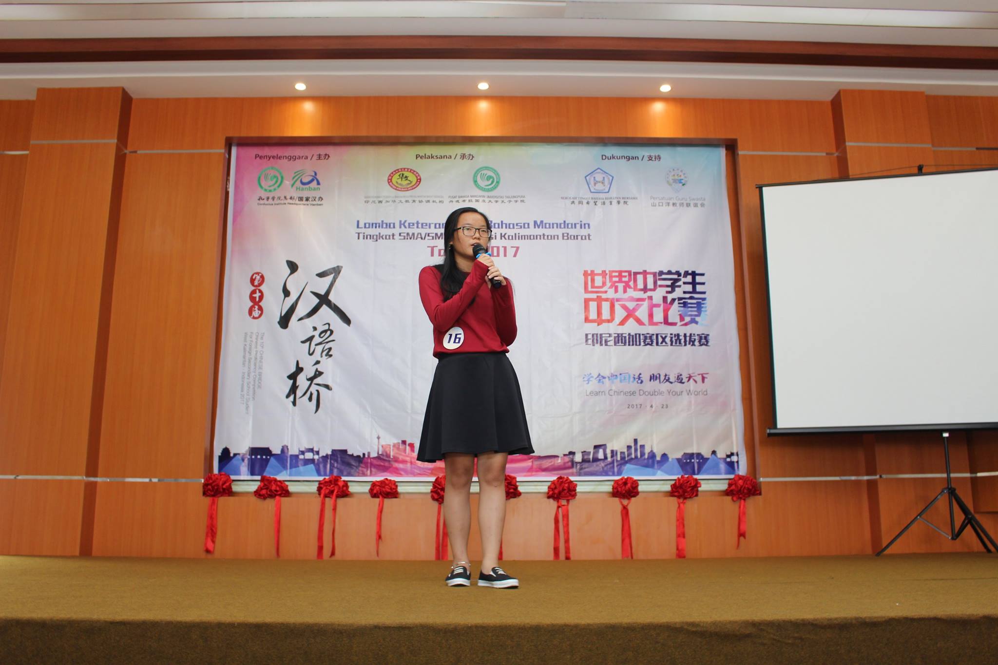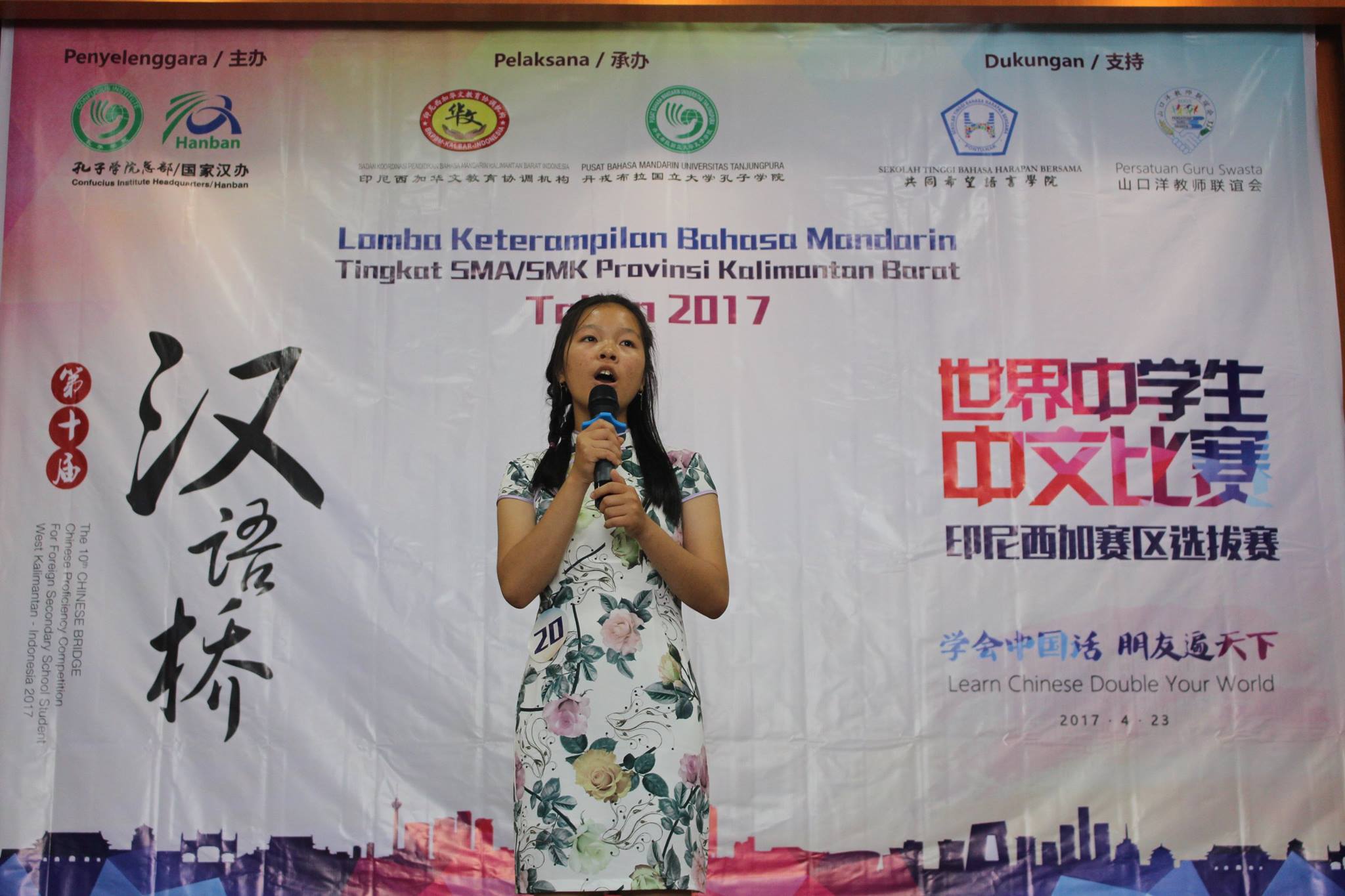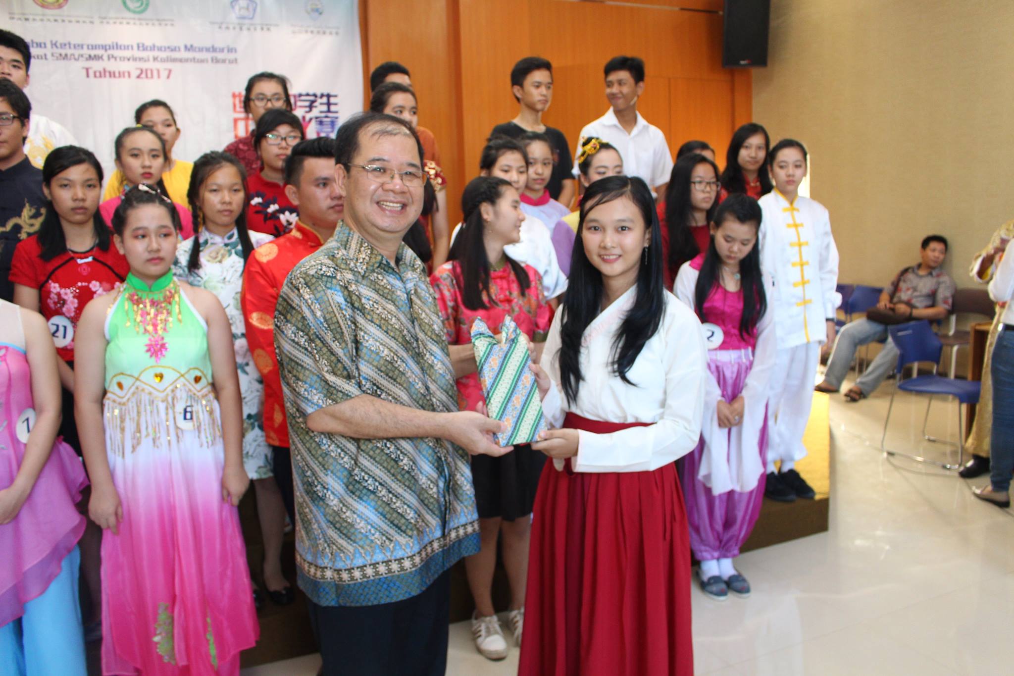 【坤甸日报讯】2017年4月23日,由丹戎布拉国立大学孔子学院和西加华文教育协调机构联合承办,由坤甸共同希望语言学院和山口洋教师联谊会协办的第十届“汉语桥”中文比赛——印尼西加省赛区选拔赛坤甸市以共同希望语言学院举行。莅临比赛现场的嘉宾有坤甸市议员刘建源先生,丹大孔院中方院长冯光火先生,西加印中商务理事代表BAPAK JIMMY THE,西加华文教育机构副主席陈得时先生、理事吴宝安先生、李鸿时先生、余炜华老师、贝成群夫人、沈丽璇女士、林瑞璇女士、刘玉瑛老师、薛惠芳老师、林丽君老师,西加协调驻道房代办黄思渊女士,坤甸共同希望语言学院校长IBU SUKARSIH DPANJAITAN MAS’UD, S.E., M.M.以及众评委、师生等逾百人出席了此次比赛。