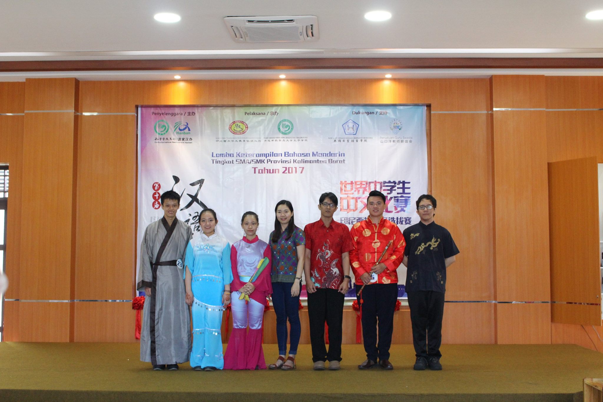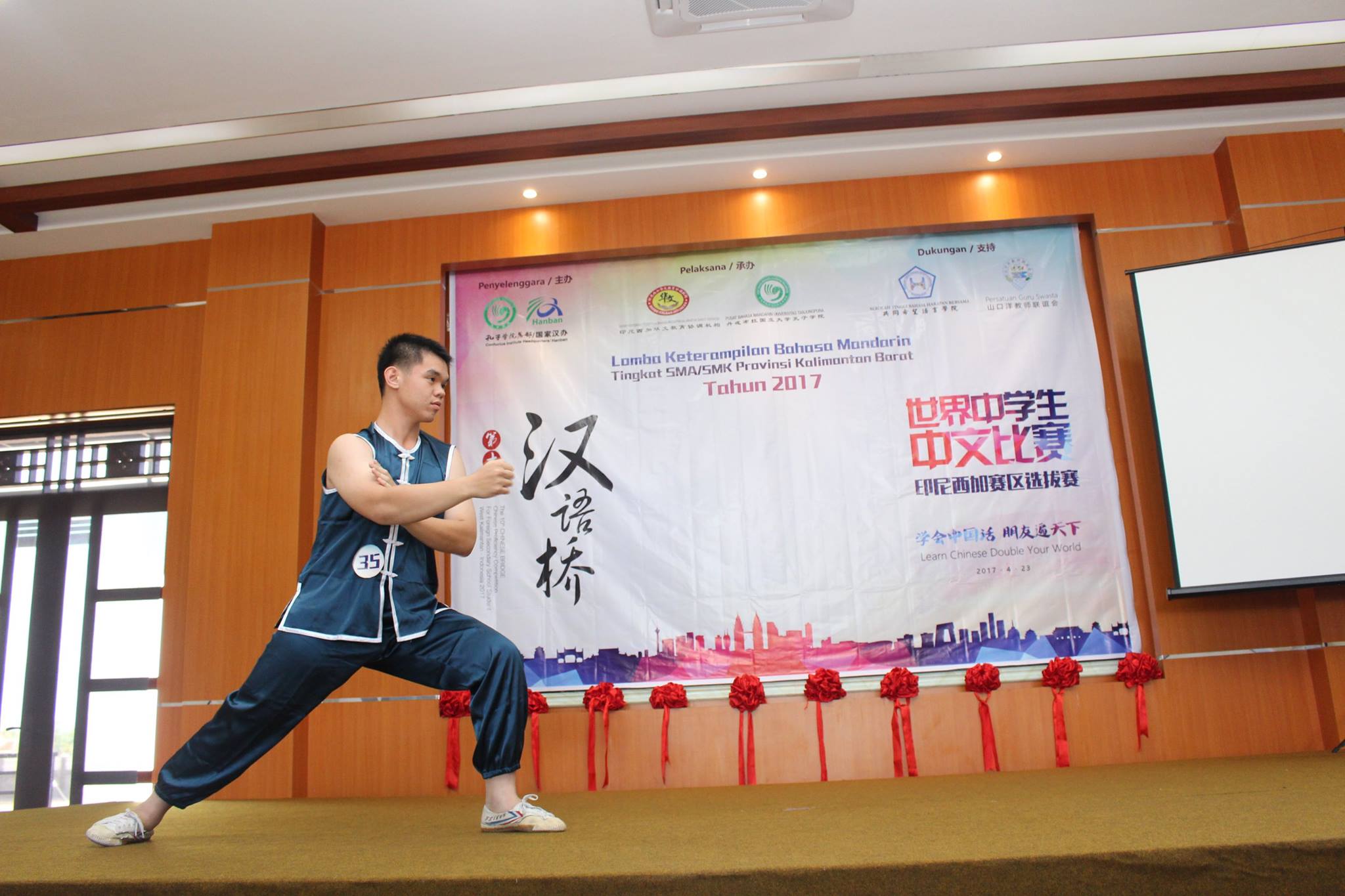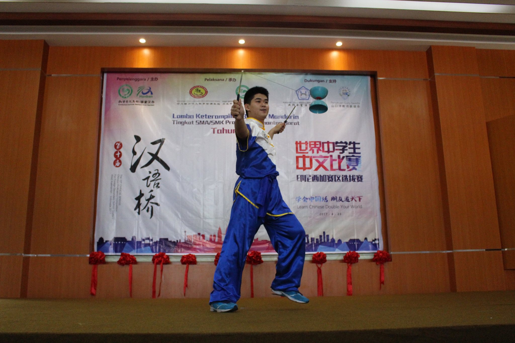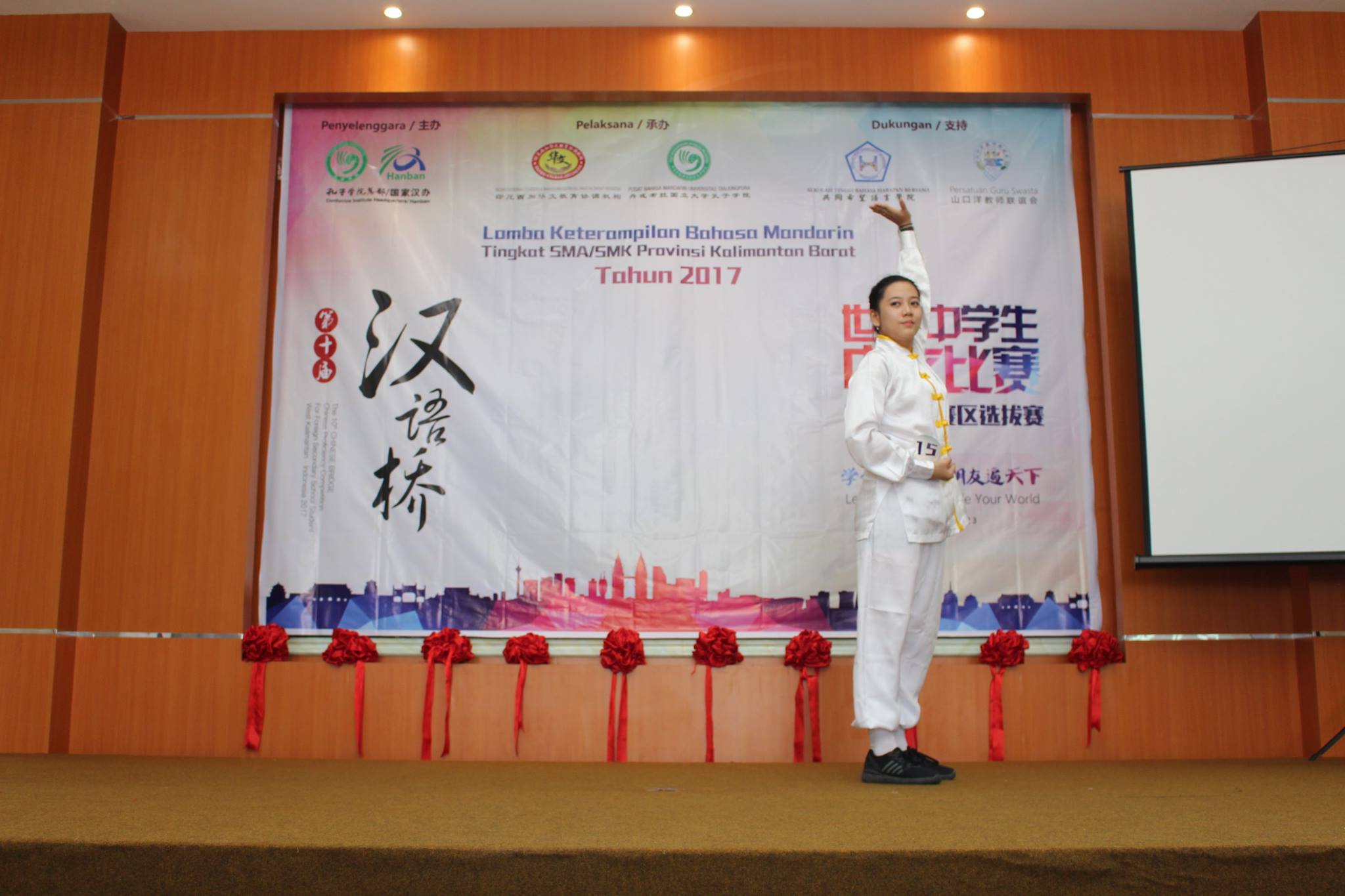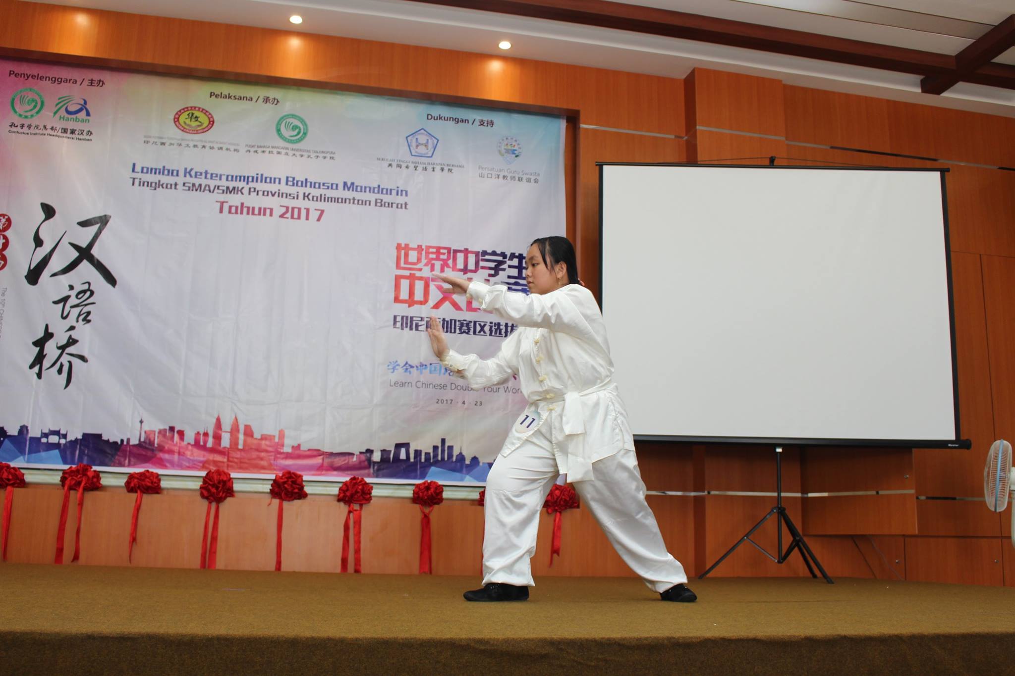 【坤甸日报讯】2017年4月23日,由丹戎布拉国立大学孔子学院和西加华文教育协调机构联合承办,由坤甸共同希望语言学院和山口洋教师联谊会协办的第十届“汉语桥”中文比赛——印尼西加省赛区选拔赛坤甸市以共同希望语言学院举行。莅临比赛现场的嘉宾有坤甸市议员刘建源先生,丹大孔院中方院长冯光火先生,西加印中商务理事代表BAPAK JIMMY THE,西加华文教育机构副主席陈得时先生、理事吴宝安先生、李鸿时先生、余炜华老师、贝成群夫人、沈丽璇女士、林瑞璇女士、刘玉瑛老师、薛惠芳老师、林丽君老师,西加协调驻道房代办黄思渊女士,坤甸共同希望语言学院校长IBU SUKARSIH DPANJAITAN MAS’UD, S.E., M.M.以及众评委、师生等逾百人出席了此次比赛。