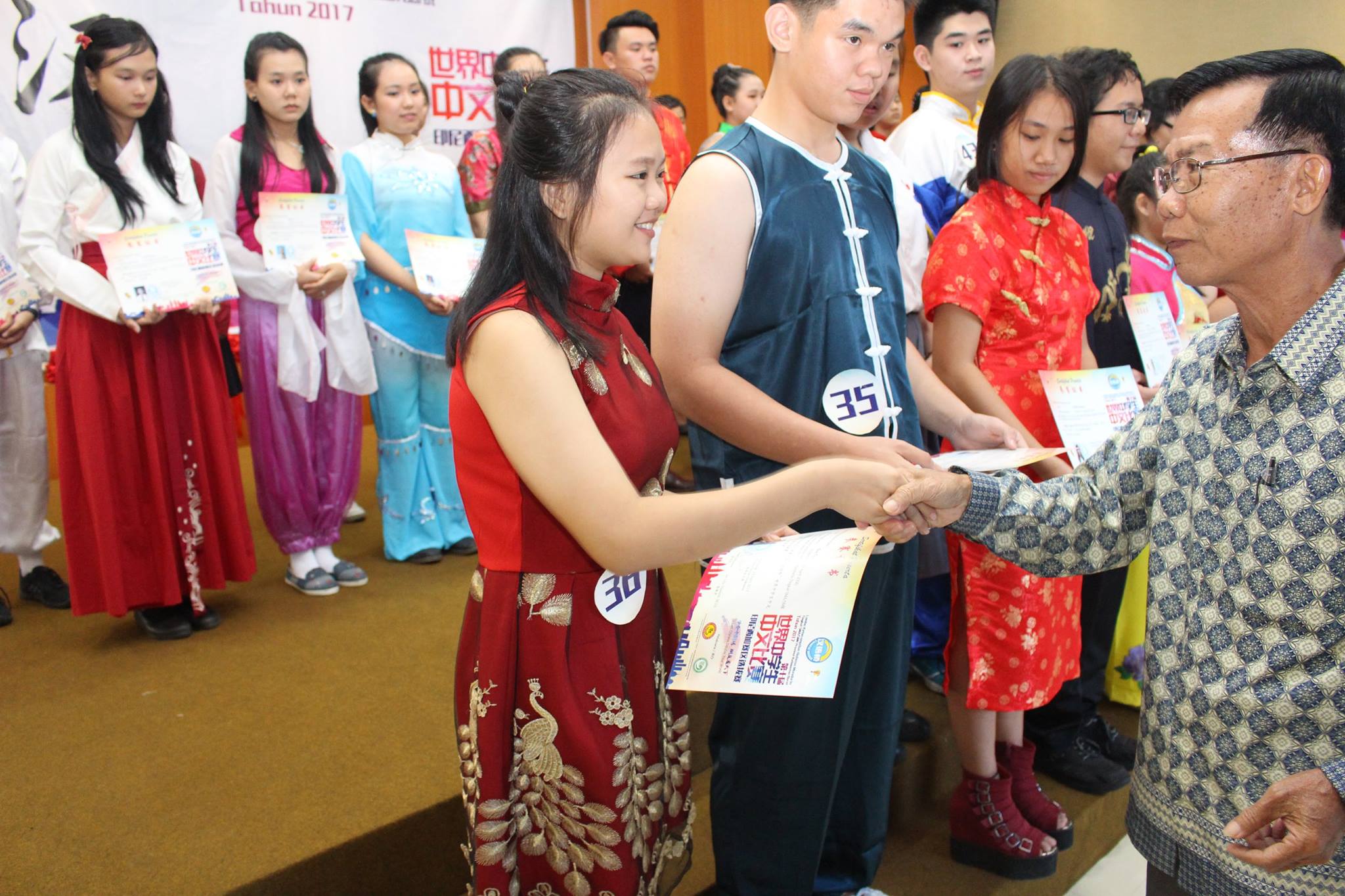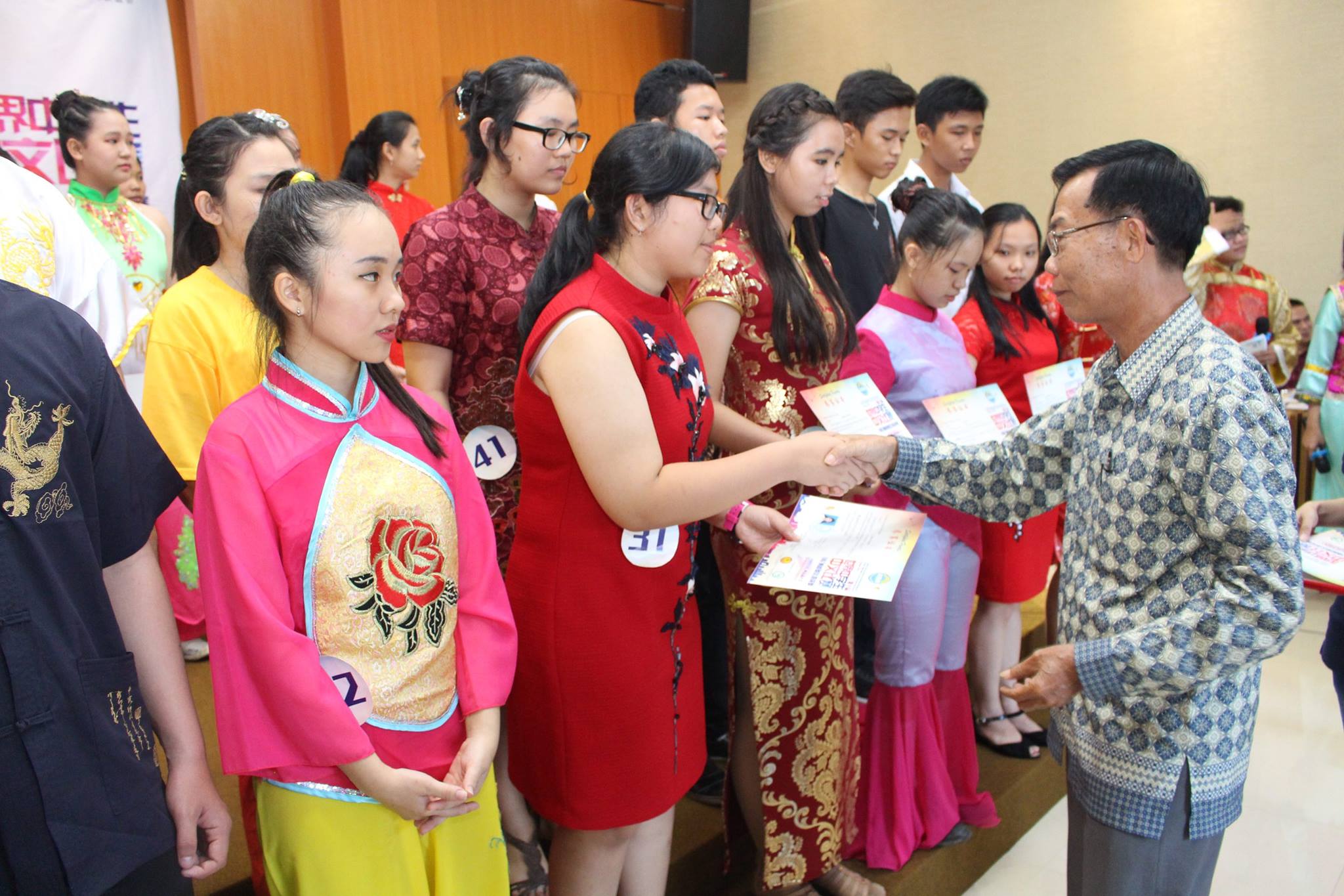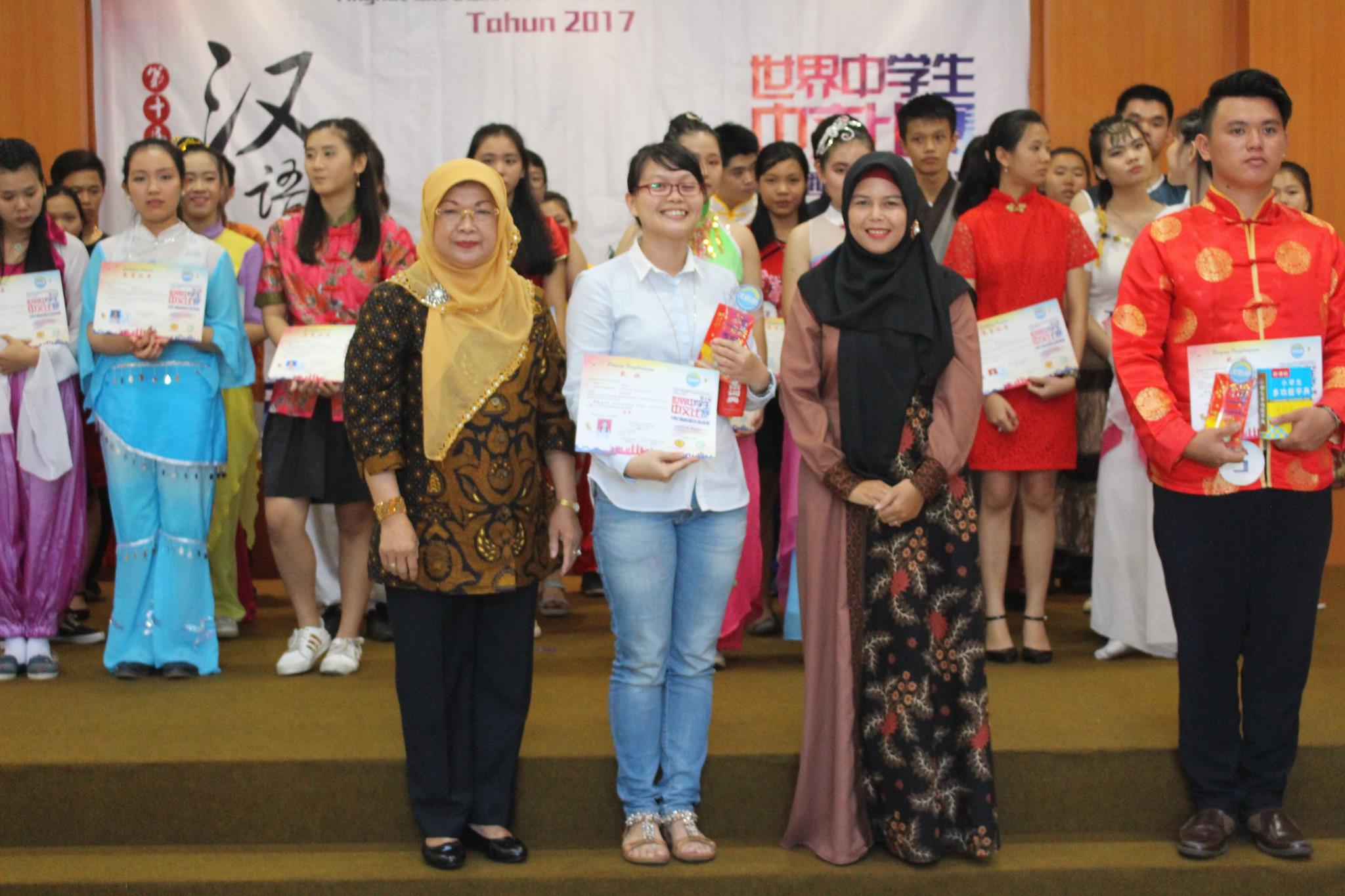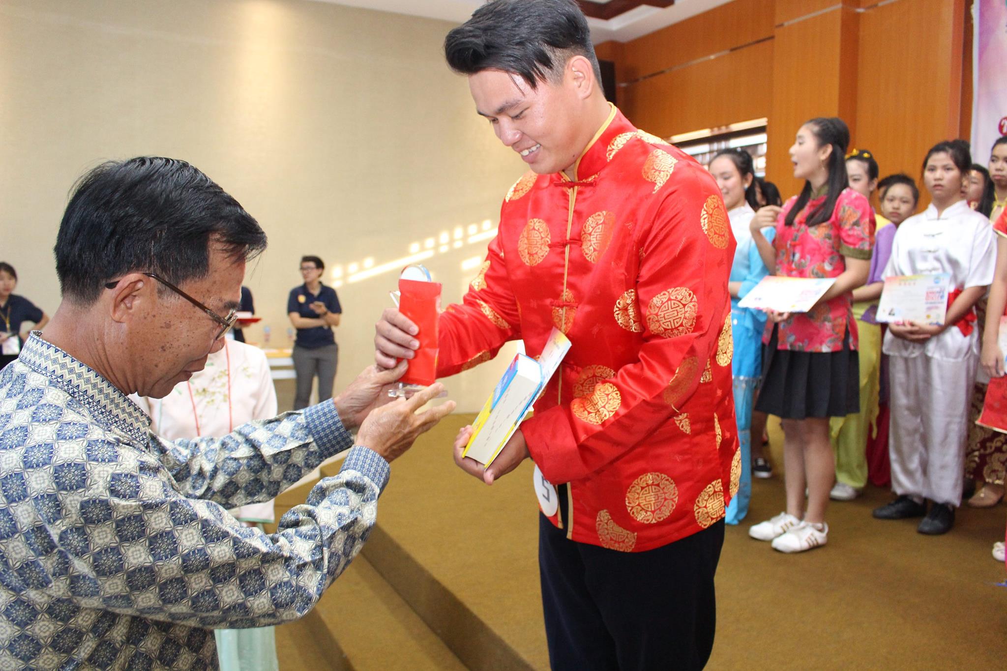 本次比赛的组委会主席陈得时先生致开幕词,汉语不仅是国际语言之一,而是成为社会的语言需求中排名第一之语言,在此鼓励西加学子更努力地学习汉语,作为炎黄子孙为西加增光添彩。汉语桥办得一年比一年好,报名的选手一年比一年多,这是西加华文教育的成果,也是教育的一种正能量。有一名来自道房的学生,由于该校没有设汉语课程,于是没有为她辅导的老师,但这名选手因为对汉语的热爱十分强烈,便鼓起勇气报名比赛,这份热情令人敬佩。参赛选手来自坤甸地区29名,山口洋地区14名,道房地区1名,共44名,其中1名是非华族选手。