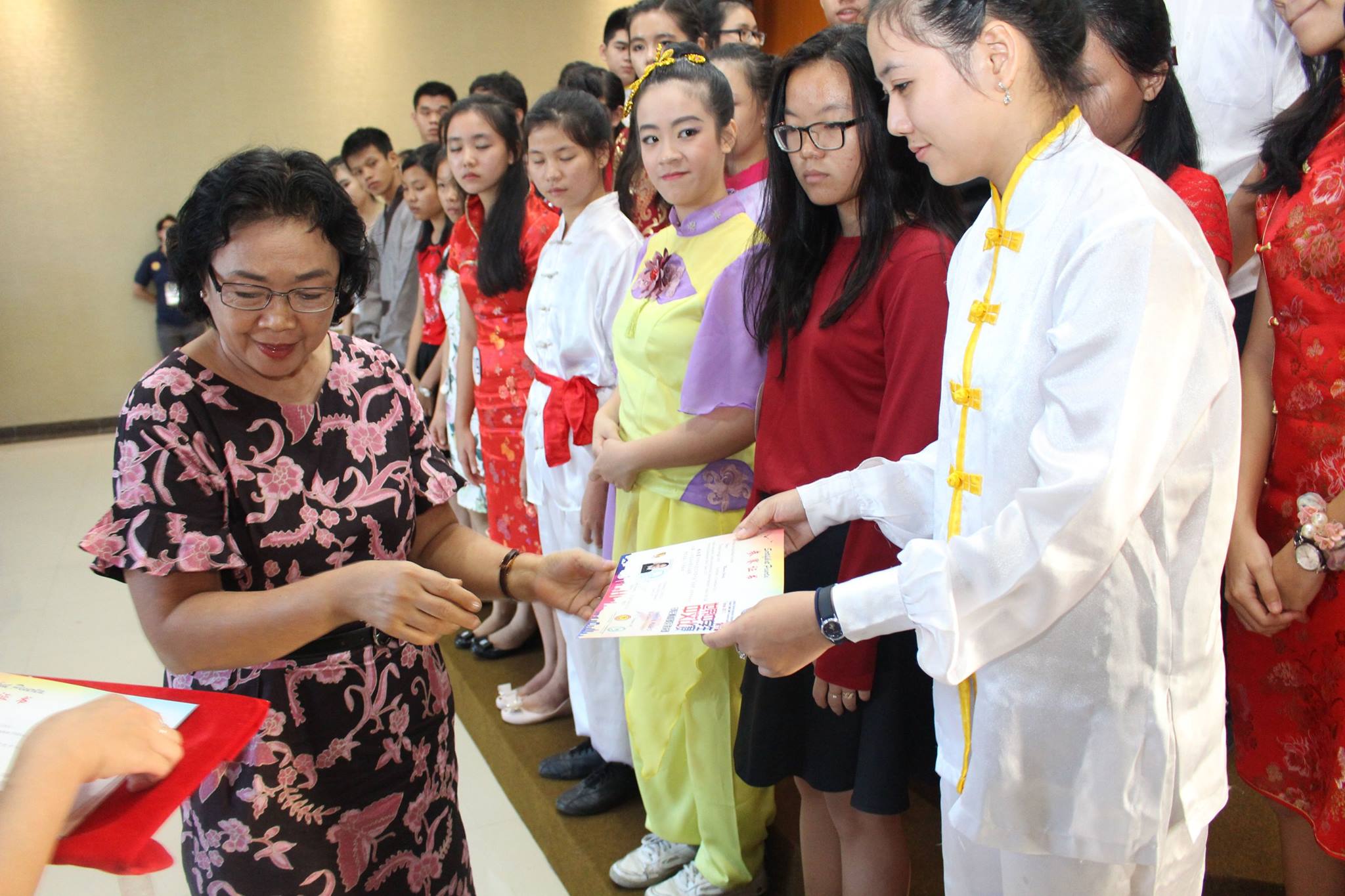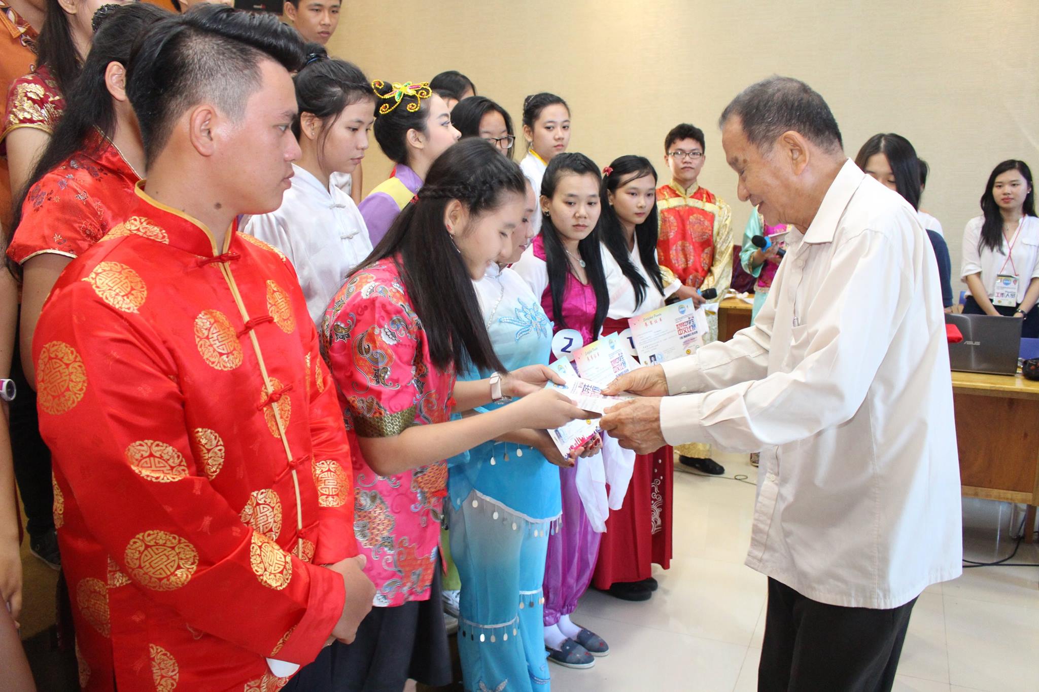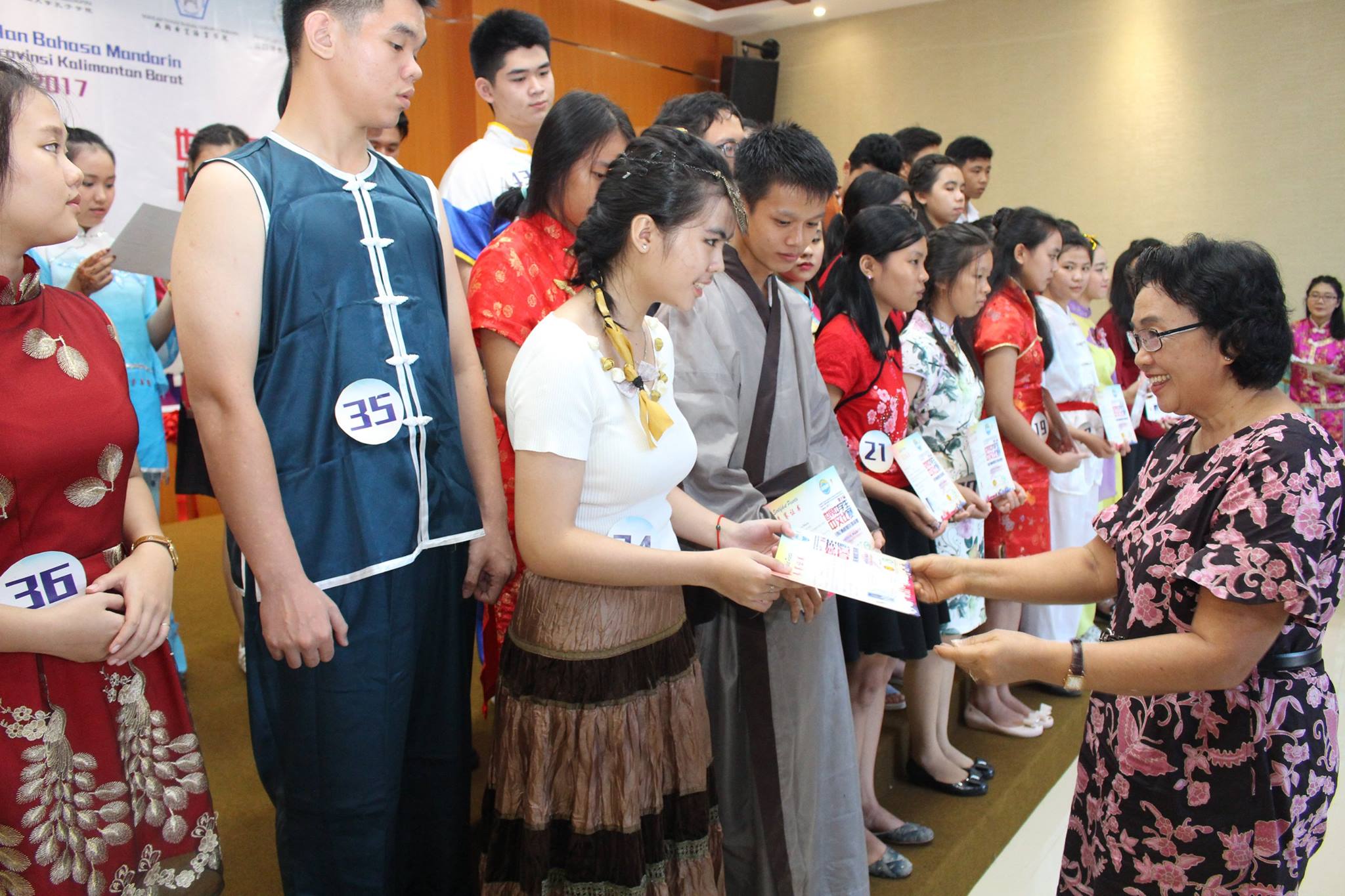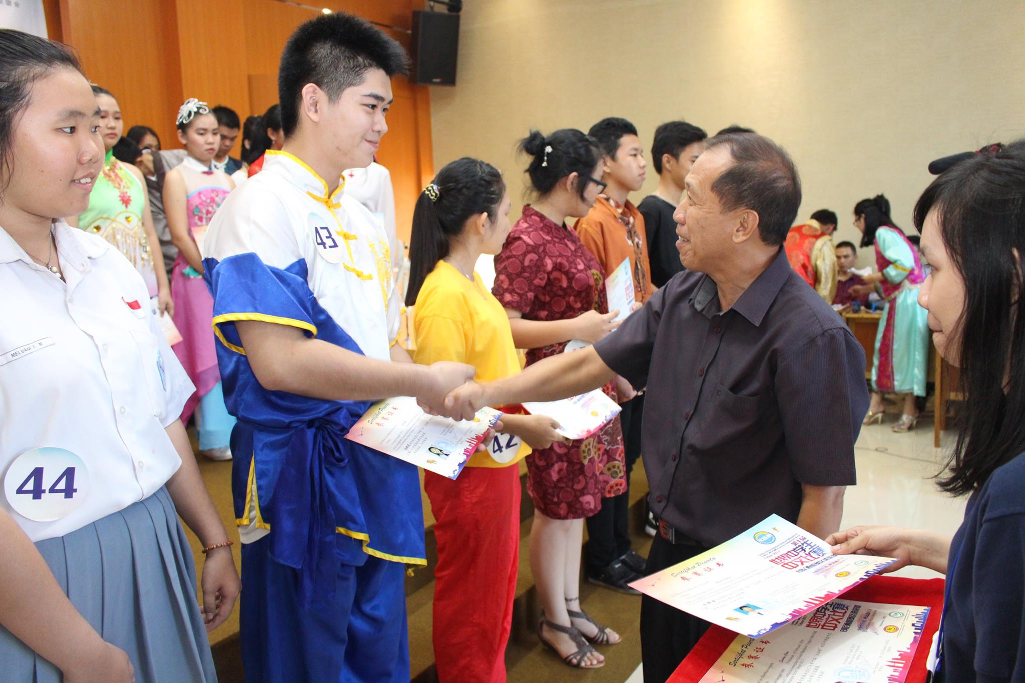 本次比赛的组委会主席陈得时先生致开幕词,汉语不仅是国际语言之一,而是成为社会的语言需求中排名第一之语言,在此鼓励西加学子更努力地学习汉语,作为炎黄子孙为西加增光添彩。汉语桥办得一年比一年好,报名的选手一年比一年多,这是西加华文教育的成果,也是教育的一种正能量。有一名来自道房的学生,由于该校没有设汉语课程,于是没有为她辅导的老师,但这名选手因为对汉语的热爱十分强烈,便鼓起勇气报名比赛,这份热情令人敬佩。参赛选手来自坤甸地区29名,山口洋地区14名,道房地区1名,共44名,其中1名是非华族选手。